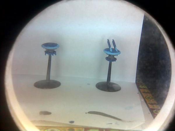 The one on the left is the GW Shield Drone. On the right we have a drone I made using a Shield Generator and a Gun Drone. Filed down the little bits where the guns would go, glued the shield generator to the bottom and drilled using a Dremel tool until I hit Sunshine.