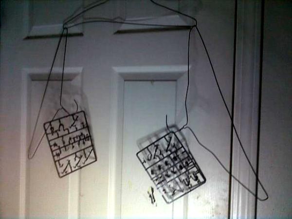 Took three wire hangers to make something to hold the sprues while I primed them yesterday.