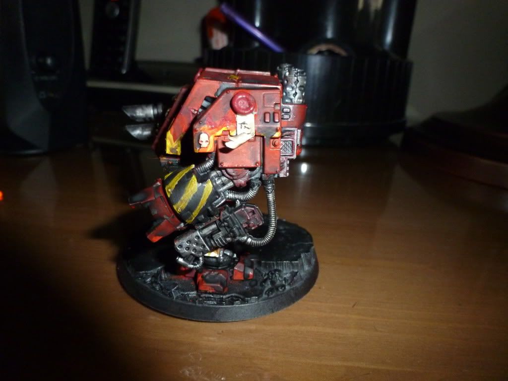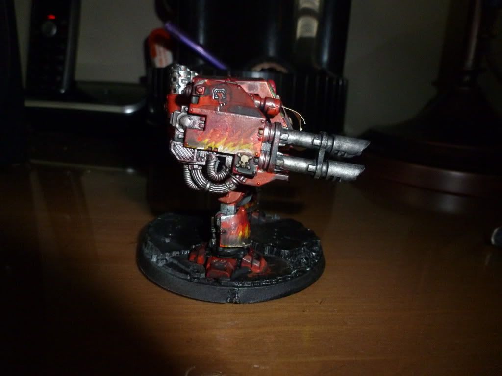Color scheme is Great, but it looks like you need to slow down a bit and work on brush control (black/yellow stripes, for example). Lay off the black wash a bit to preserve your colors. Try a brown wash on the red, then do the flames, after you re-highlight the dark red areas. Use the black wash for the metallic areas.