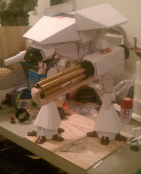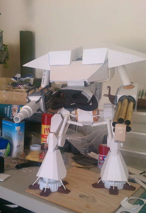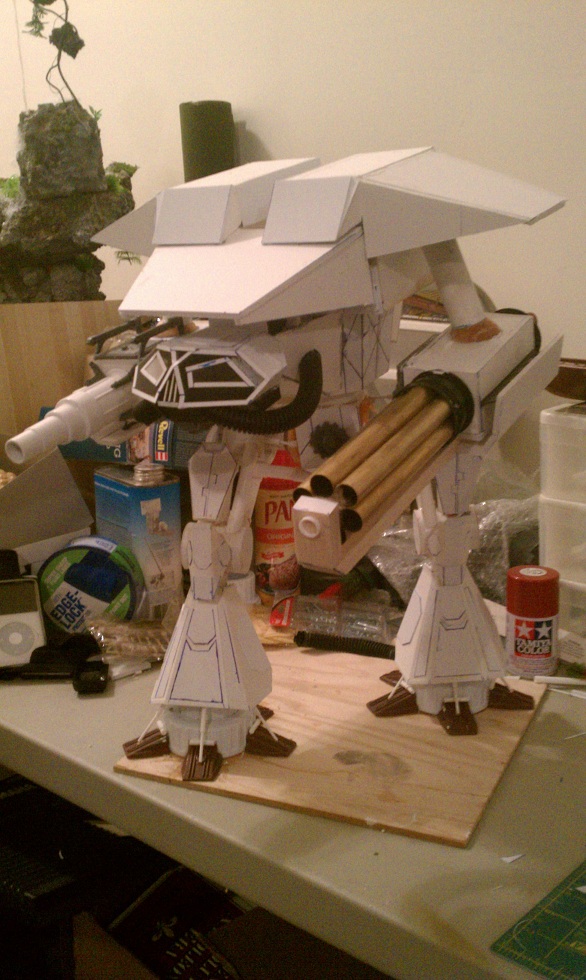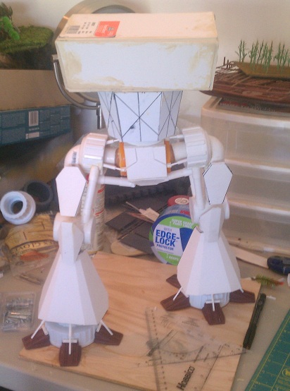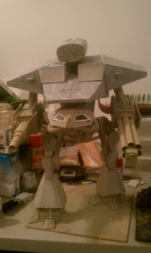 I finished up the actual building today. This picture was taken before I put on the weapon shields. Now all I have to do is build the rocket pod and do a LOT of detail work.