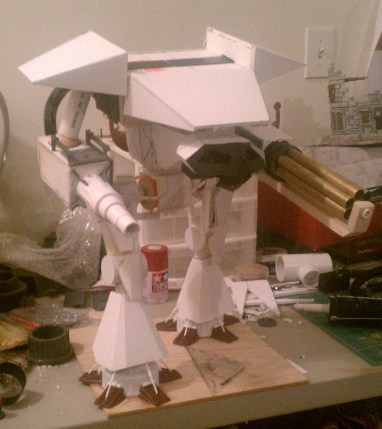 The base material is actually foam-core, which I have never really liked until now. Using it with this has been great though, because you can cut angles into the inner side of it and bend it without having any seams. The frame is mostly PVC, with the upper body being a mix of plasticard and foam core. The weapons are a mash-up of plumbing bits, plasticard, GW bitz, and foam core. The only thing I would change is that the Gatling Blaster's barrels are made from copper tube, and if I could find a plasticard tube of the same diameter I would rather do that because the damn thing is pretty heavy (comparatively).