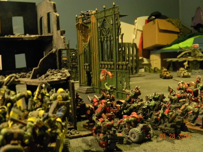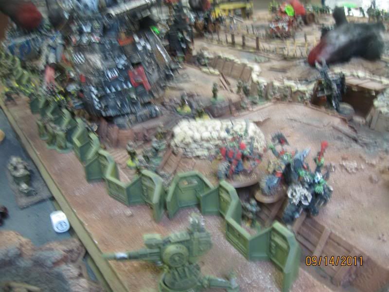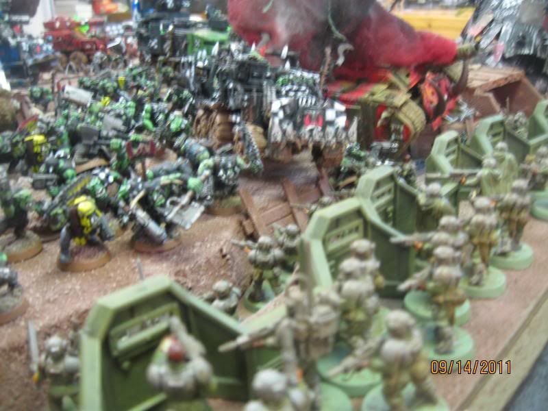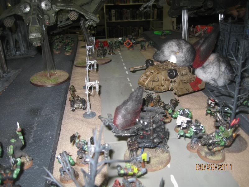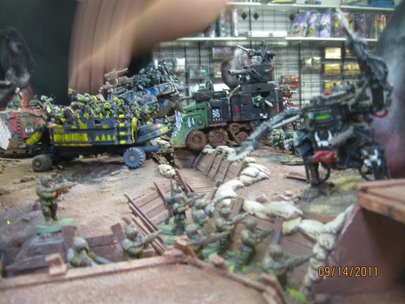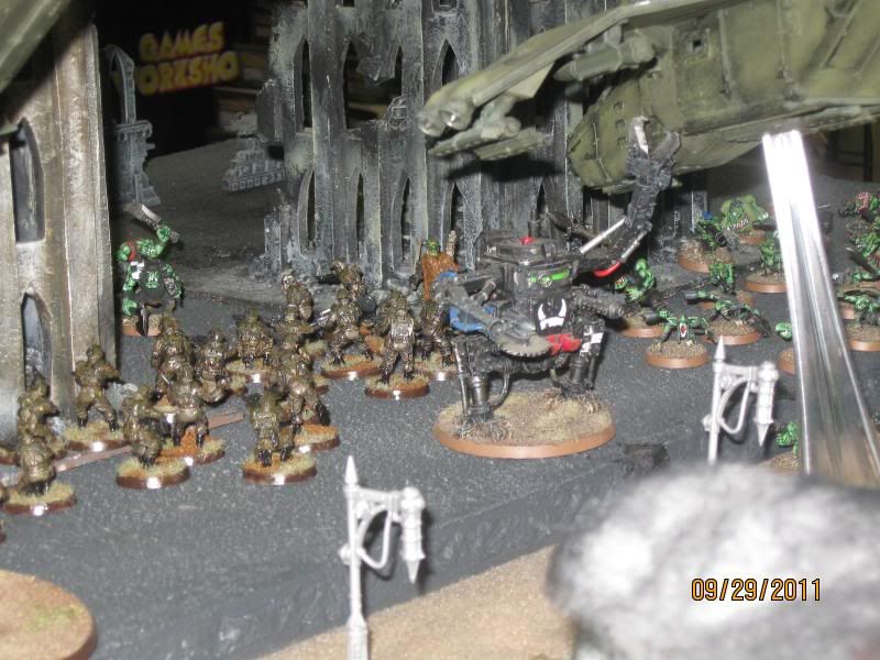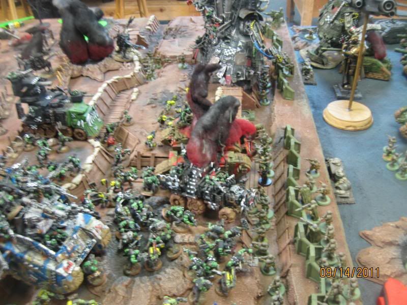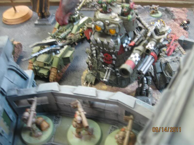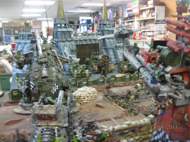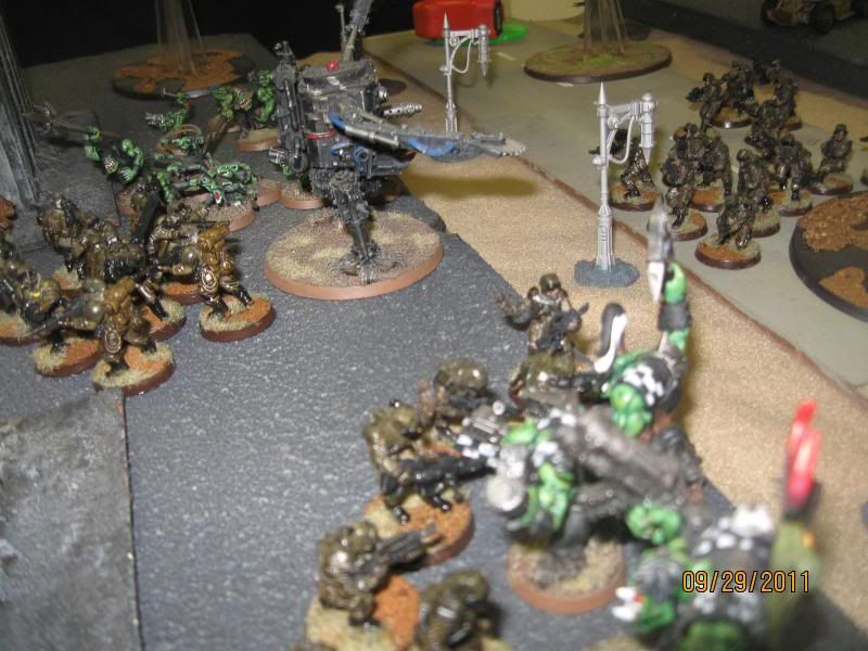 sorry about the crappy pics . i took the wrong camera . but any way .... the story continues ...... fighting bravely the imperial guard fought the green skin invaders the whole way . making them pay for every inch thecame . all heavy weapons and tanks concentrated there fire power crippling and destroying a big mek stompa . making it go apocloypitic ! and exploing taking tons of infantry with . the second goth stompa had its drives blown out immobilizing it just at the edge of trench line . another victory . preventing that mechanized monster from reaching the wall . but the last and final stompa waded throgh the imperial lines tossing tanks aside throwing its self against the imperial cities wall . every imperial force fired upon it . tearing armor away trying to prevent it from breaching the wall . but the mek stompa clawed away finaly colasping a section off the wall . but in vain the imperial forces were able to hold off the ork horde . so not one vile green skin was permited to enter the city a epic victory ., for the imperial guard . sadly though the invasion is far from over . Grak Trot Bita evil plans have been set and many more waves of blood thirst greens are assending on the planet . The govenor successfully reached the landing pad and his arvis transport . on route to the comms tower north in the city .hope fully he can send a more potent distress signal with this aceint relay of the machine gods . while flying on his way flying over the citie . he could see the real reality of the war rageing around . This ork invasion was well under way . even though they had massive sucess at the gate other parts of the city were not as lucky . almost upon landing at the comms tower . a ork fighta bomb streaked bye fireing its weapons in to the govenors ship . " sir i have starboard engine damage ! i'm going to have to put her down in aleevi sector ! hold on , brace for a crash landing my lord !!!!!.............................to be continued !