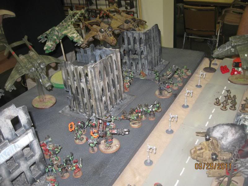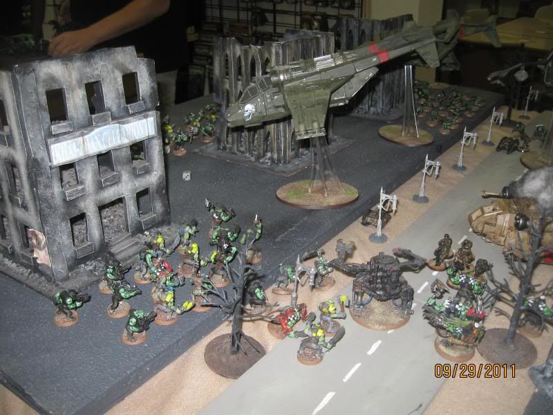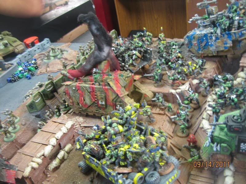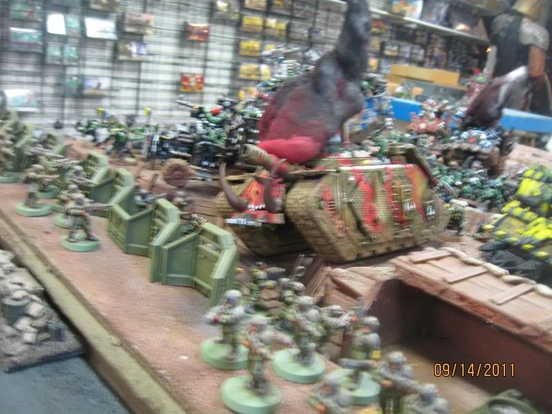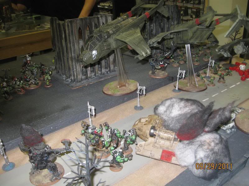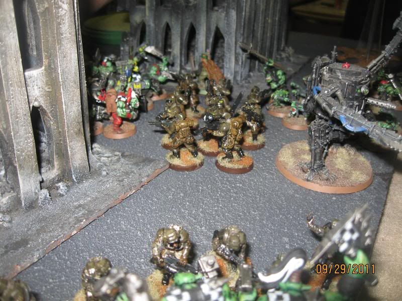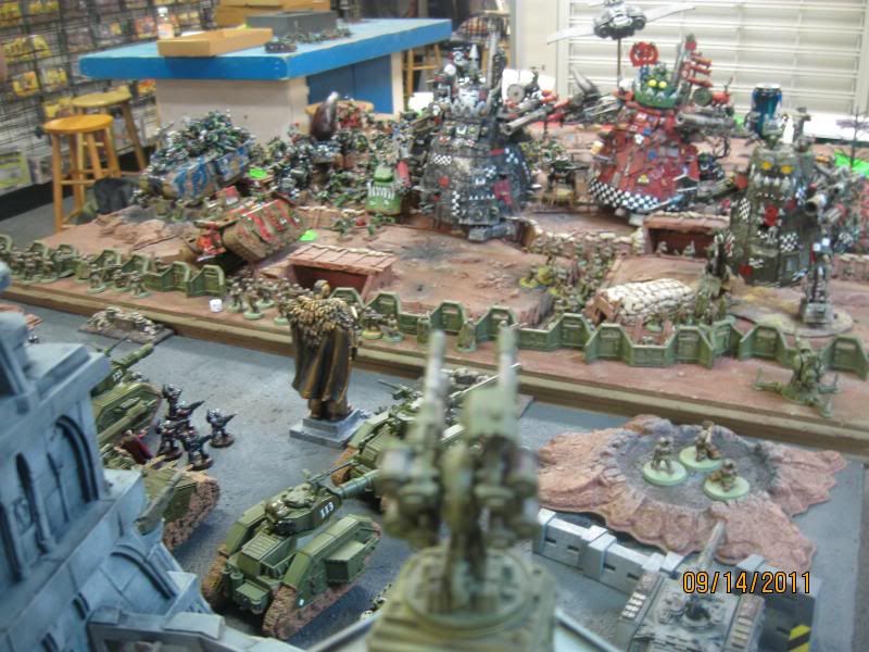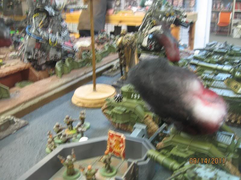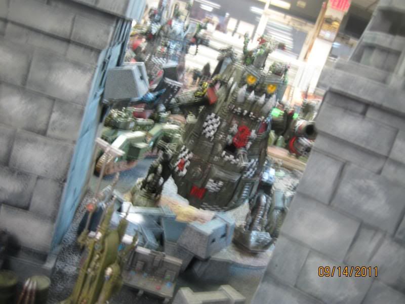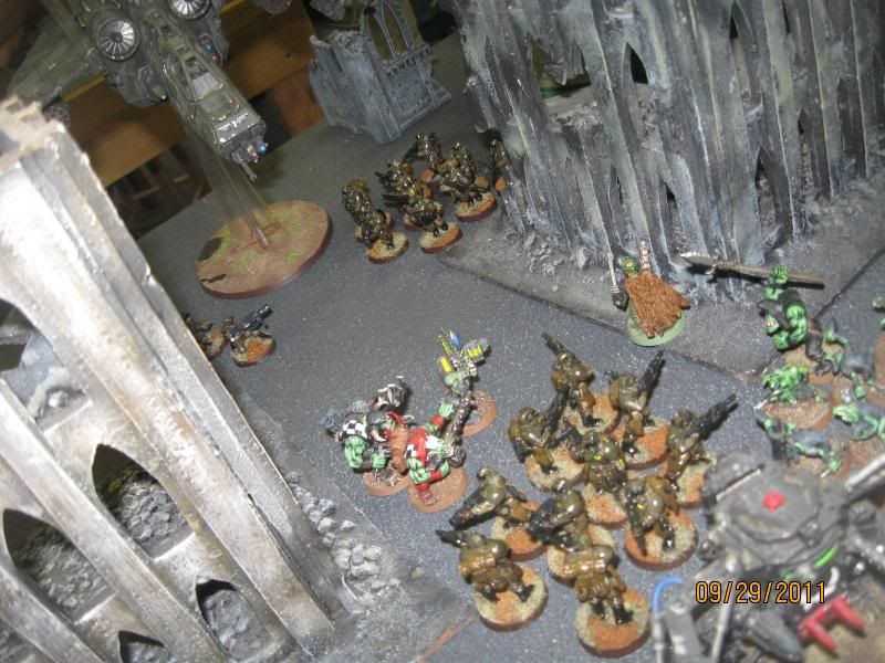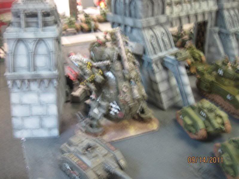 sorry about the crappy pics . i took the wrong camera . but any way .... the story continues ...... fighting bravely the imperial guard fought the green skin invaders the whole way . making them pay for every inch thecame . all heavy weapons and tanks concentrated there fire power crippling and destroying a big mek stompa . making it go apocloypitic ! and exploing taking tons of infantry with . the second goth stompa had its drives blown out immobilizing it just at the edge of trench line . another victory . preventing that mechanized monster from reaching the wall . but the last and final stompa waded throgh the imperial lines tossing tanks aside throwing its self against the imperial cities wall . every imperial force fired upon it . tearing armor away trying to prevent it from breaching the wall . but the mek stompa clawed away finaly colasping a section off the wall . but in vain the imperial forces were able to hold off the ork horde . so not one vile green skin was permited to enter the city a epic victory ., for the imperial guard . sadly though the invasion is far from over . Grak Trot Bita evil plans have been set and many more waves of blood thirst greens are assending on the planet . The govenor successfully reached the landing pad and his arvis transport . on route to the comms tower north in the city .hope fully he can send a more potent distress signal with this aceint relay of the machine gods . while flying on his way flying over the citie . he could see the real reality of the war rageing around . This ork invasion was well under way . even though they had massive sucess at the gate other parts of the city were not as lucky . almost upon landing at the comms tower . a ork fighta bomb streaked bye fireing its weapons in to the govenors ship . " sir i have starboard engine damage ! i'm going to have to put her down in aleevi sector ! hold on , brace for a crash landing my lord !!!!!.............................to be continued !