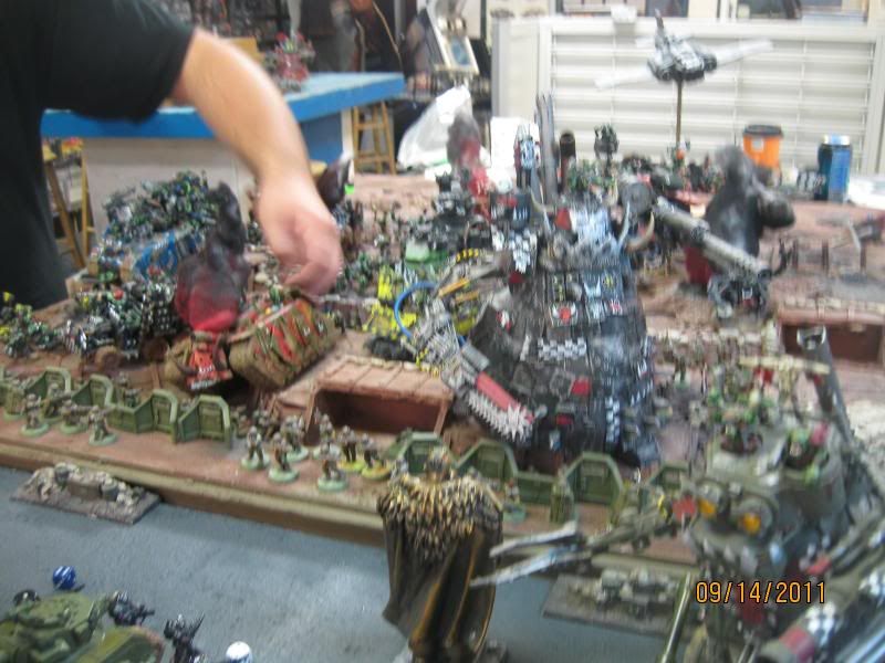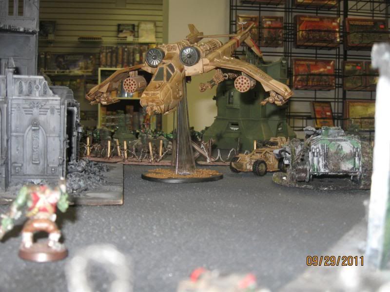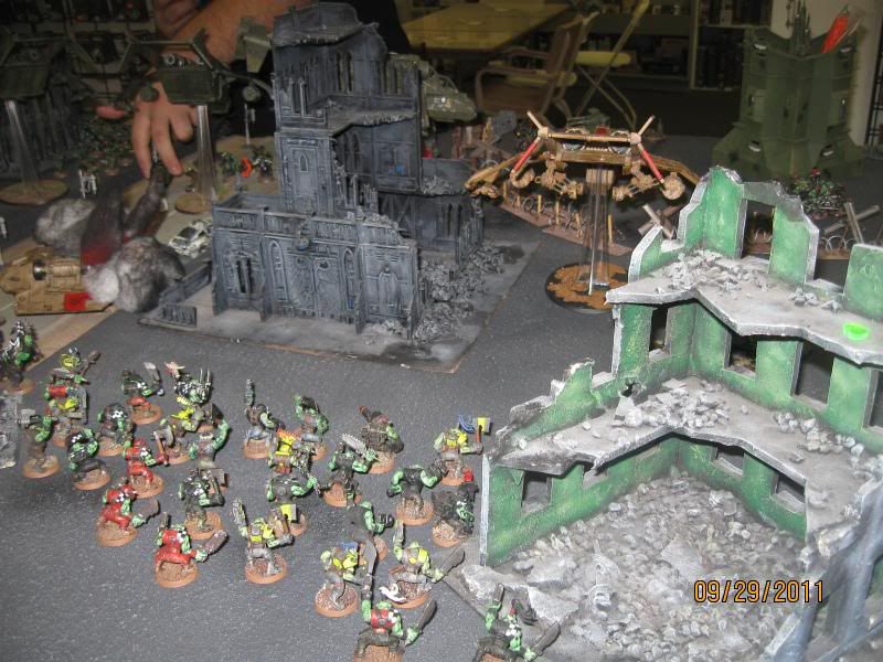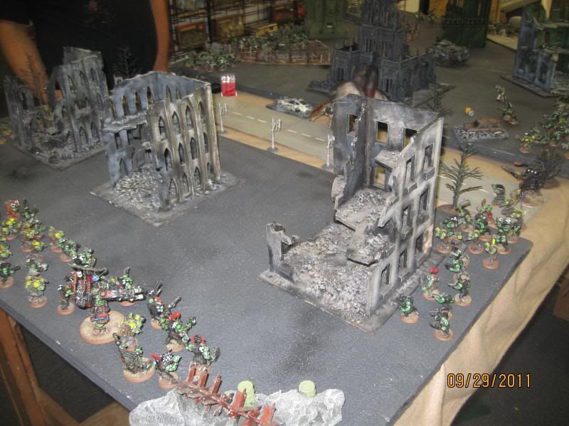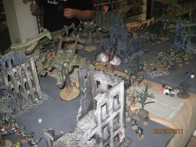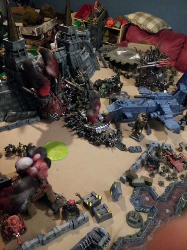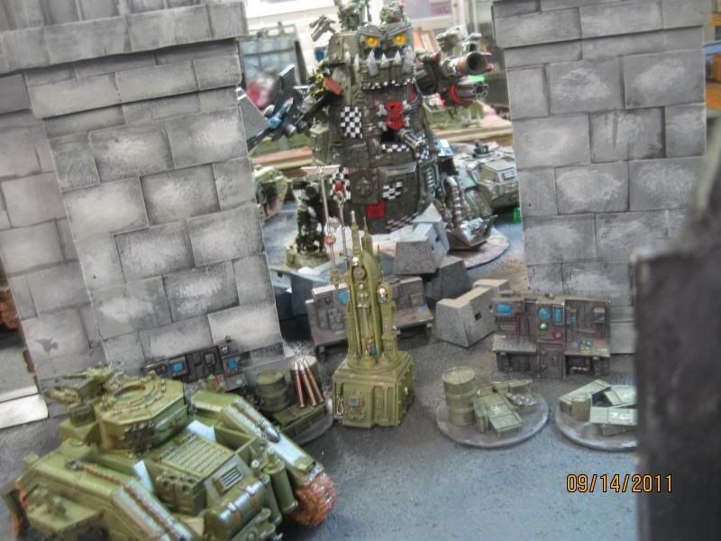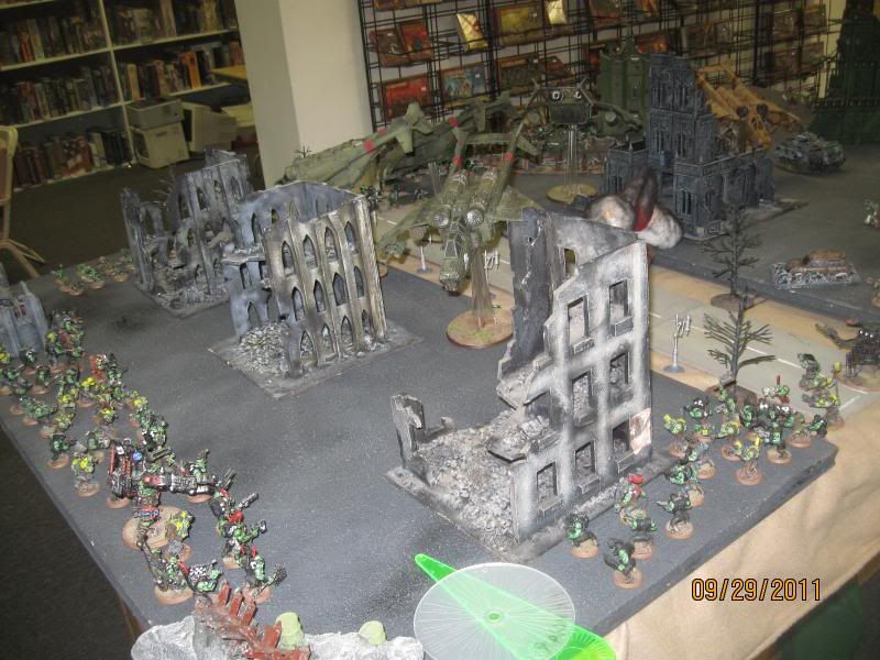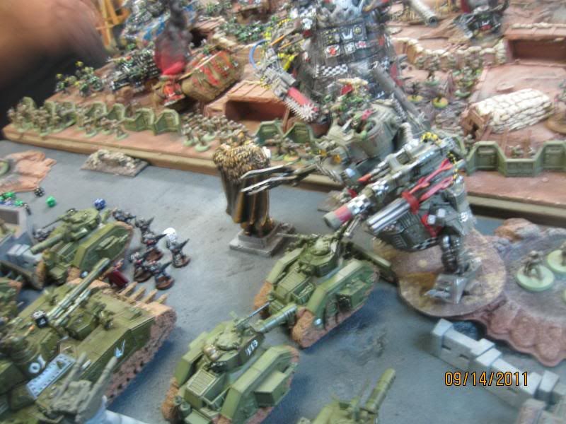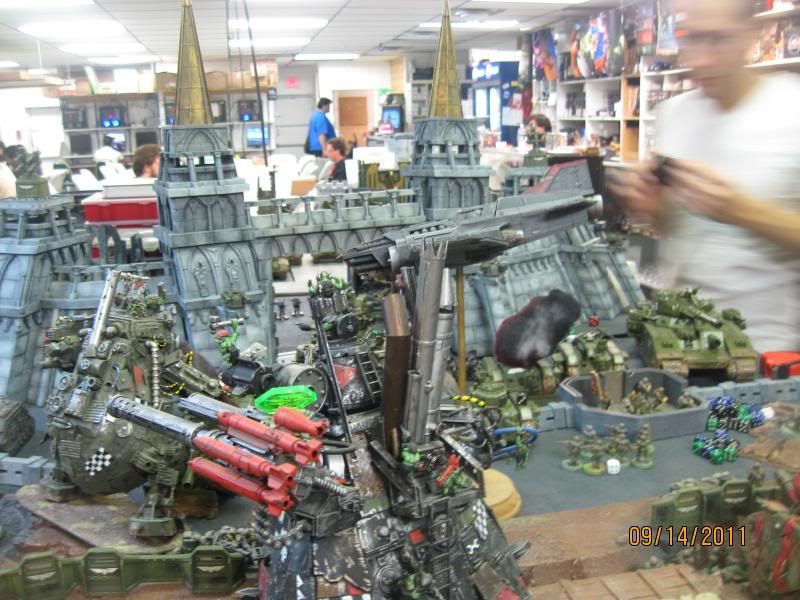 sorry about the crappy pics . i took the wrong camera . but any way .... the story continues ...... fighting bravely the imperial guard fought the green skin invaders the whole way . making them pay for every inch thecame . all heavy weapons and tanks concentrated there fire power crippling and destroying a big mek stompa . making it go apocloypitic ! and exploing taking tons of infantry with . the second goth stompa had its drives blown out immobilizing it just at the edge of trench line . another victory . preventing that mechanized monster from reaching the wall . but the last and final stompa waded throgh the imperial lines tossing tanks aside throwing its self against the imperial cities wall . every imperial force fired upon it . tearing armor away trying to prevent it from breaching the wall . but the mek stompa clawed away finaly colasping a section off the wall . but in vain the imperial forces were able to hold off the ork horde . so not one vile green skin was permited to enter the city a epic victory ., for the imperial guard . sadly though the invasion is far from over . Grak Trot Bita evil plans have been set and many more waves of blood thirst greens are assending on the planet . The govenor successfully reached the landing pad and his arvis transport . on route to the comms tower north in the city .hope fully he can send a more potent distress signal with this aceint relay of the machine gods . while flying on his way flying over the citie . he could see the real reality of the war rageing around . This ork invasion was well under way . even though they had massive sucess at the gate other parts of the city were not as lucky . almost upon landing at the comms tower . a ork fighta bomb streaked bye fireing its weapons in to the govenors ship . " sir i have starboard engine damage ! i'm going to have to put her down in aleevi sector ! hold on , brace for a crash landing my lord !!!!!.............................to be continued !