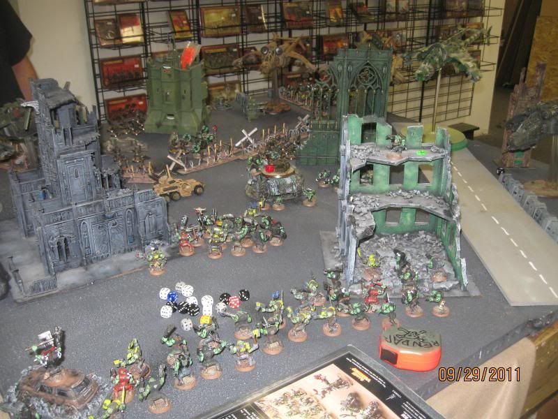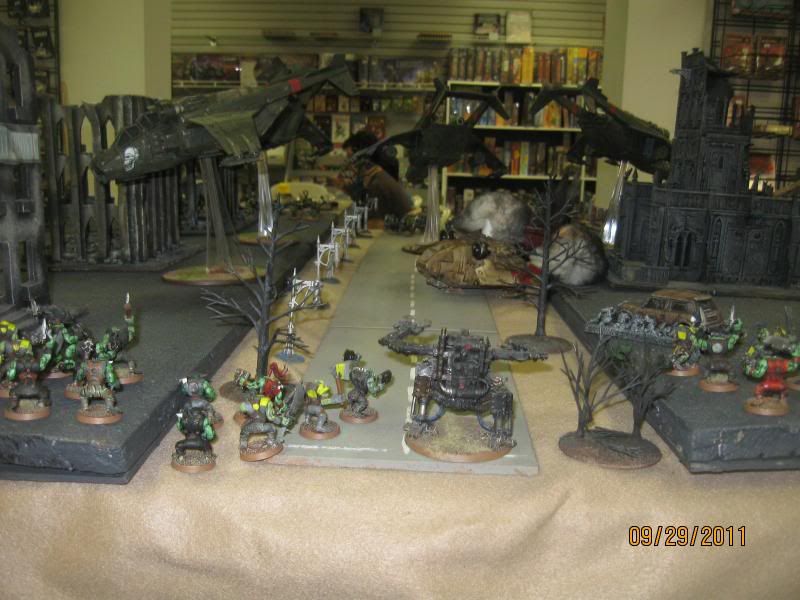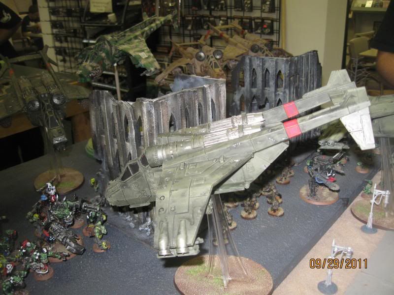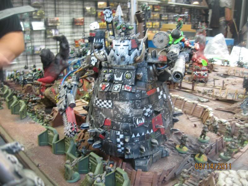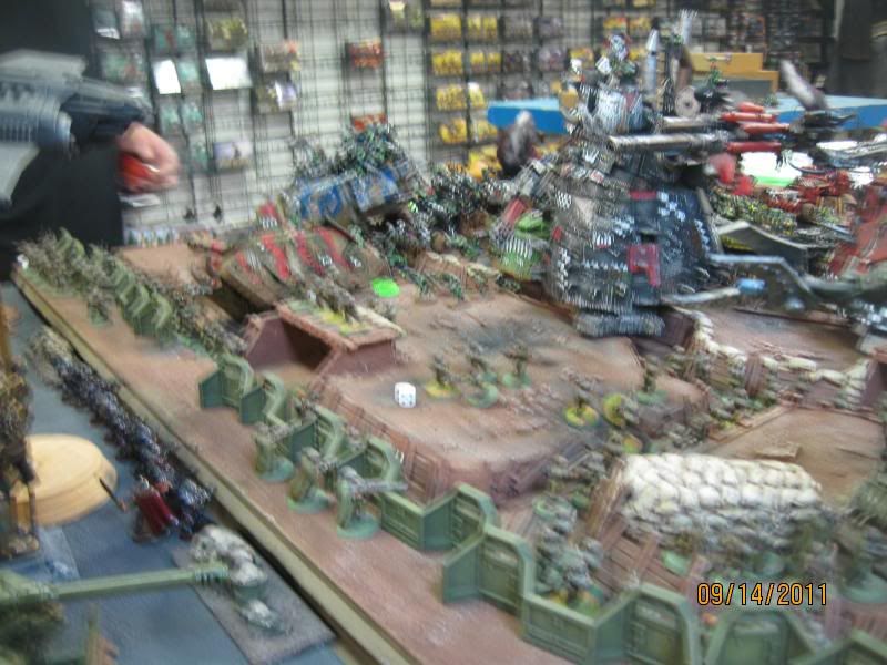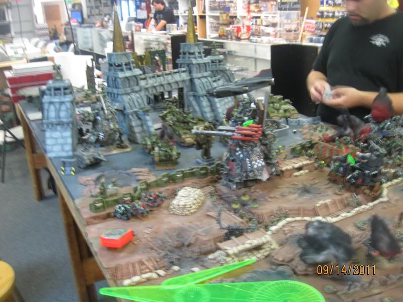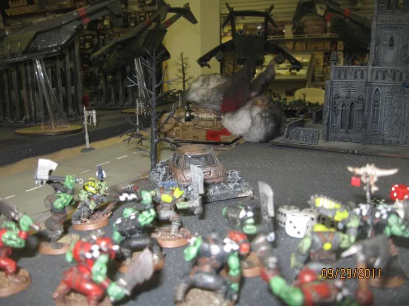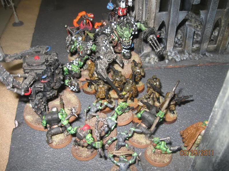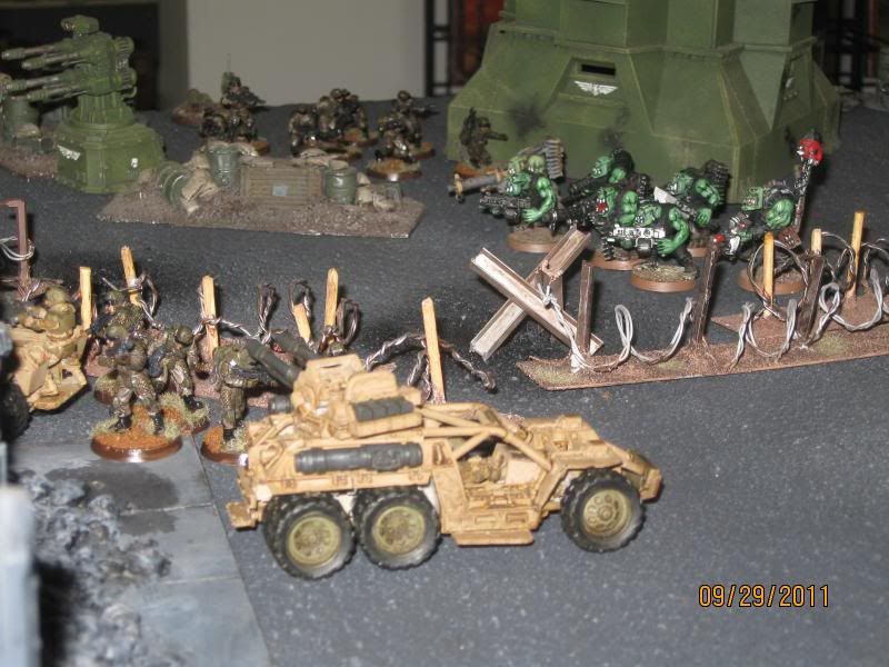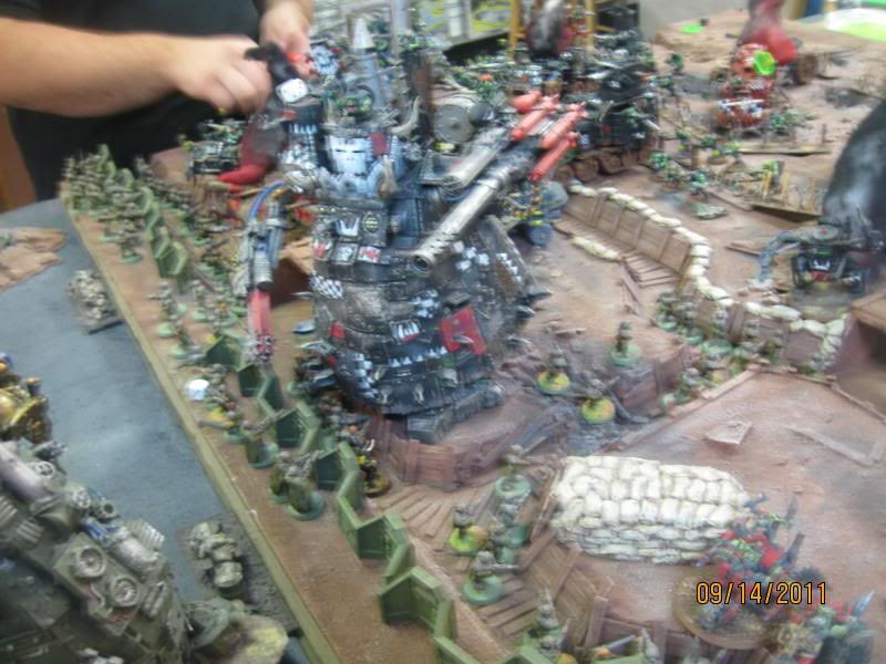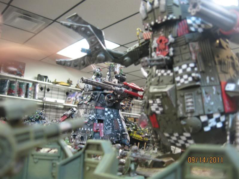 sorry about the crappy pics . i took the wrong camera . but any way .... the story continues ...... fighting bravely the imperial guard fought the green skin invaders the whole way . making them pay for every inch thecame . all heavy weapons and tanks concentrated there fire power crippling and destroying a big mek stompa . making it go apocloypitic ! and exploing taking tons of infantry with . the second goth stompa had its drives blown out immobilizing it just at the edge of trench line . another victory . preventing that mechanized monster from reaching the wall . but the last and final stompa waded throgh the imperial lines tossing tanks aside throwing its self against the imperial cities wall . every imperial force fired upon it . tearing armor away trying to prevent it from breaching the wall . but the mek stompa clawed away finaly colasping a section off the wall . but in vain the imperial forces were able to hold off the ork horde . so not one vile green skin was permited to enter the city a epic victory ., for the imperial guard . sadly though the invasion is far from over . Grak Trot Bita evil plans have been set and many more waves of blood thirst greens are assending on the planet . The govenor successfully reached the landing pad and his arvis transport . on route to the comms tower north in the city .hope fully he can send a more potent distress signal with this aceint relay of the machine gods . while flying on his way flying over the citie . he could see the real reality of the war rageing around . This ork invasion was well under way . even though they had massive sucess at the gate other parts of the city were not as lucky . almost upon landing at the comms tower . a ork fighta bomb streaked bye fireing its weapons in to the govenors ship . " sir i have starboard engine damage ! i'm going to have to put her down in aleevi sector ! hold on , brace for a crash landing my lord !!!!!.............................to be continued !