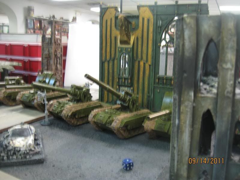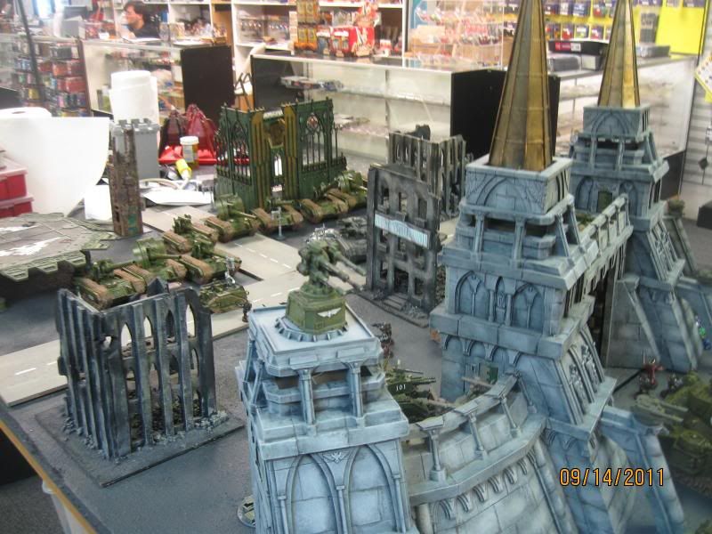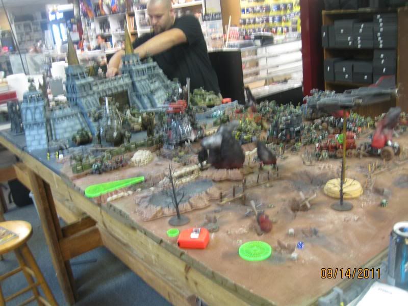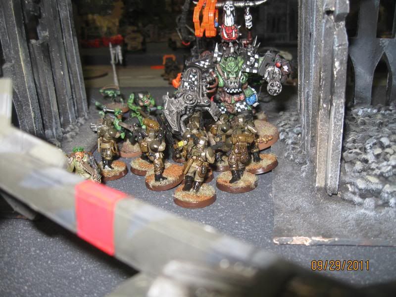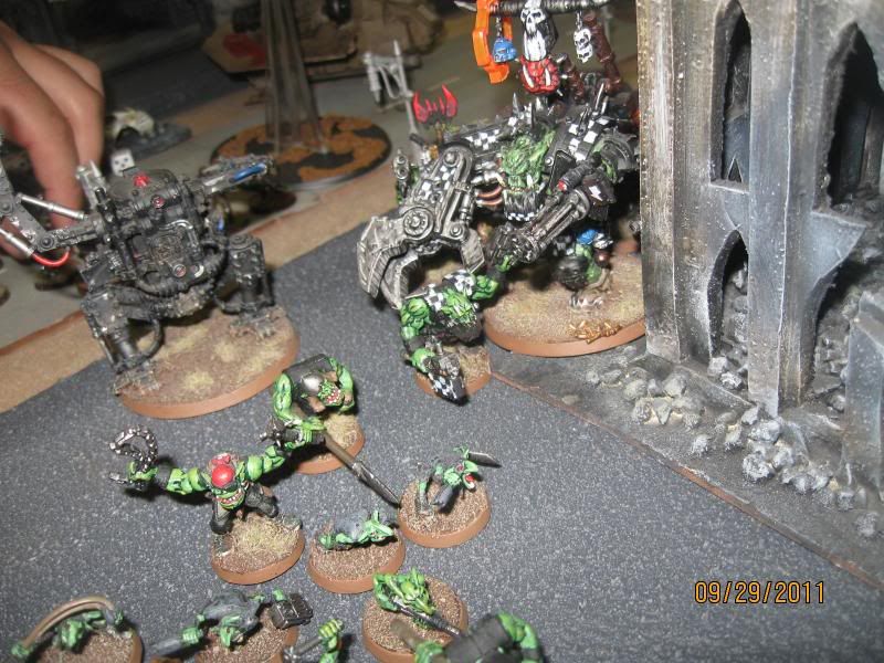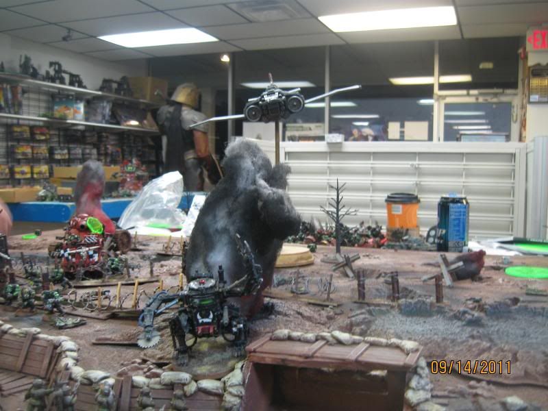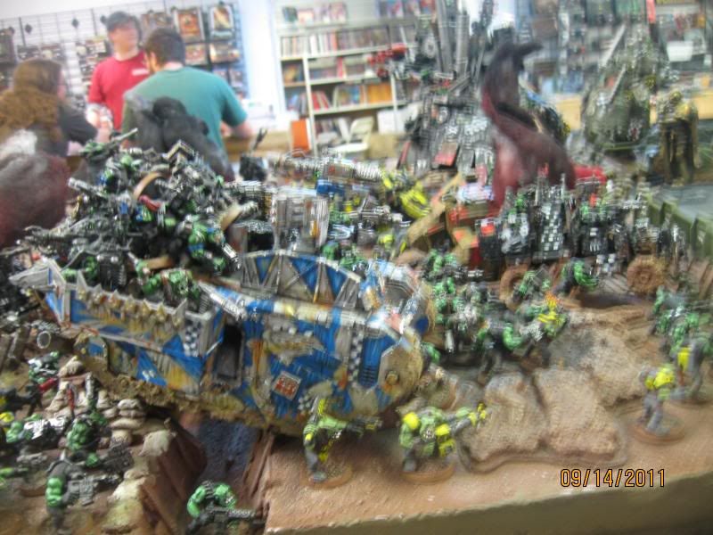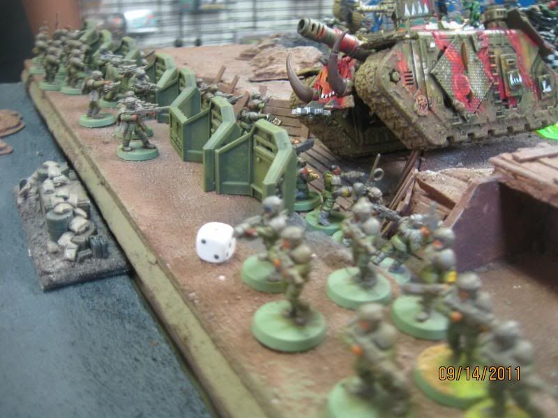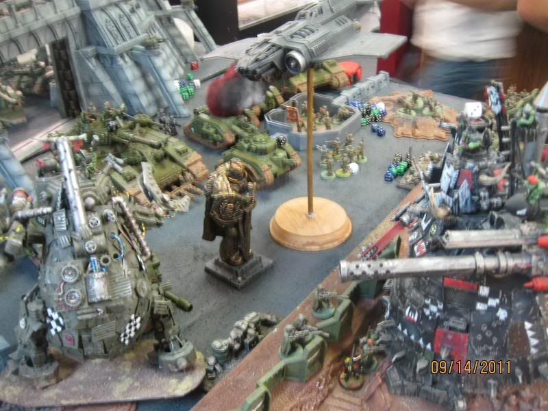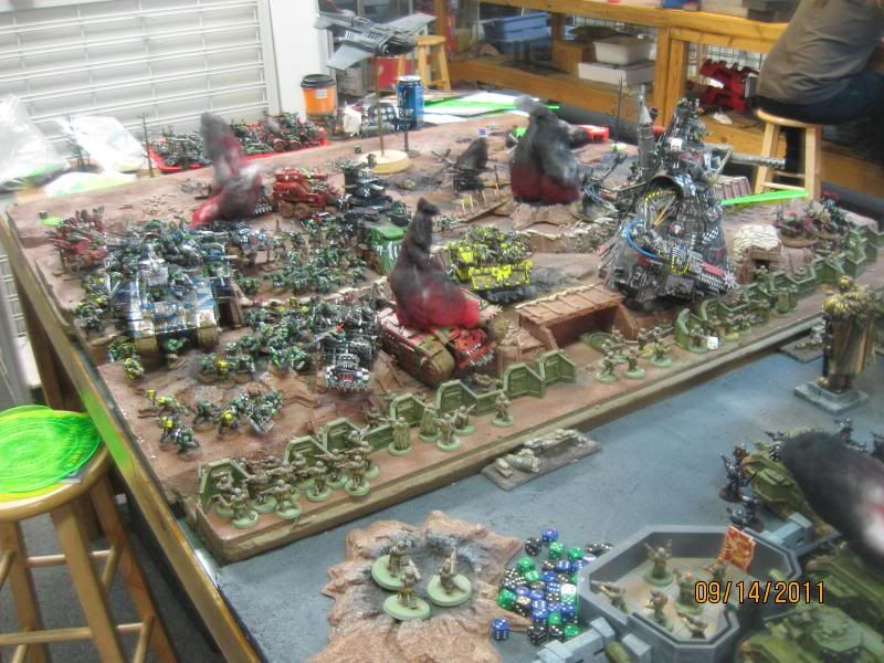 sorry about the crappy pics . i took the wrong camera . but any way .... the story continues ...... fighting bravely the imperial guard fought the green skin invaders the whole way . making them pay for every inch thecame . all heavy weapons and tanks concentrated there fire power crippling and destroying a big mek stompa . making it go apocloypitic ! and exploing taking tons of infantry with . the second goth stompa had its drives blown out immobilizing it just at the edge of trench line . another victory . preventing that mechanized monster from reaching the wall . but the last and final stompa waded throgh the imperial lines tossing tanks aside throwing its self against the imperial cities wall . every imperial force fired upon it . tearing armor away trying to prevent it from breaching the wall . but the mek stompa clawed away finaly colasping a section off the wall . but in vain the imperial forces were able to hold off the ork horde . so not one vile green skin was permited to enter the city a epic victory ., for the imperial guard . sadly though the invasion is far from over . Grak Trot Bita evil plans have been set and many more waves of blood thirst greens are assending on the planet . The govenor successfully reached the landing pad and his arvis transport . on route to the comms tower north in the city .hope fully he can send a more potent distress signal with this aceint relay of the machine gods . while flying on his way flying over the citie . he could see the real reality of the war rageing around . This ork invasion was well under way . even though they had massive sucess at the gate other parts of the city were not as lucky . almost upon landing at the comms tower . a ork fighta bomb streaked bye fireing its weapons in to the govenors ship . " sir i have starboard engine damage ! i'm going to have to put her down in aleevi sector ! hold on , brace for a crash landing my lord !!!!!.............................to be continued !