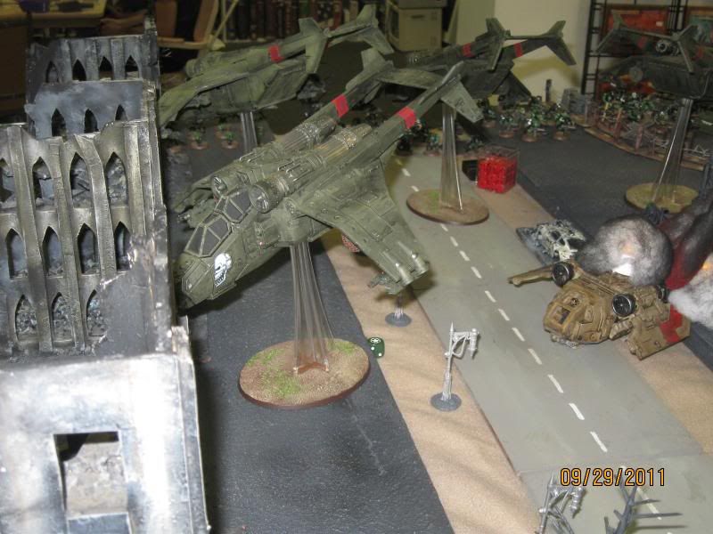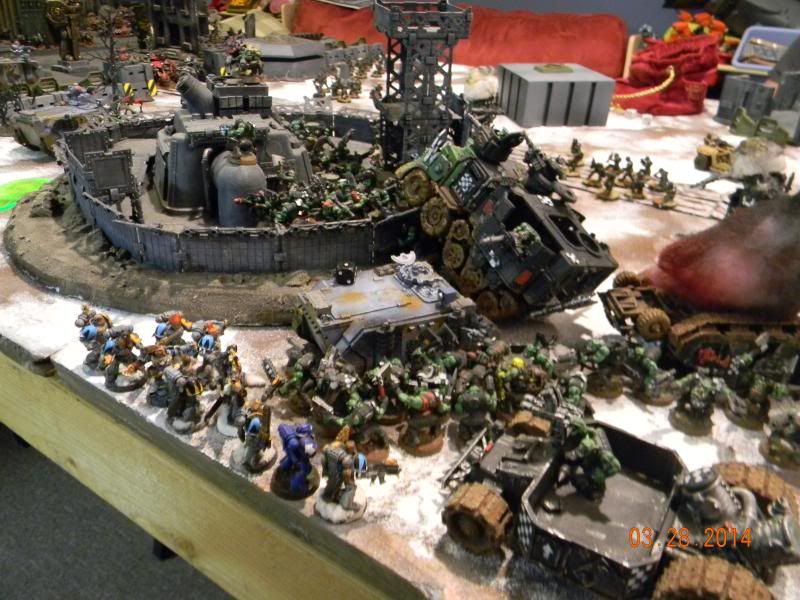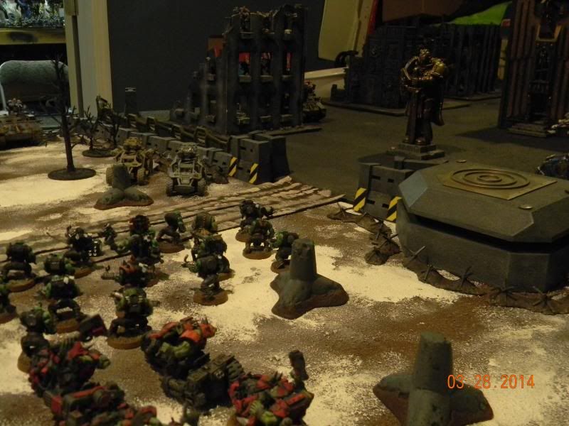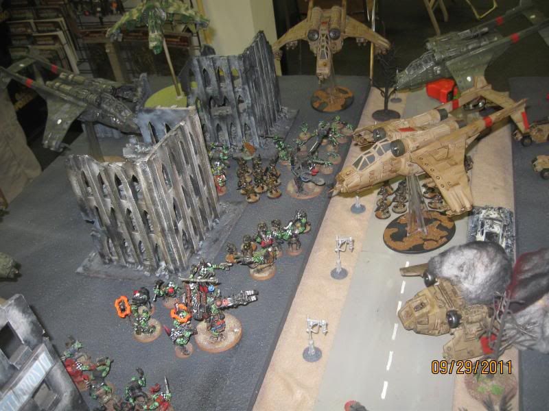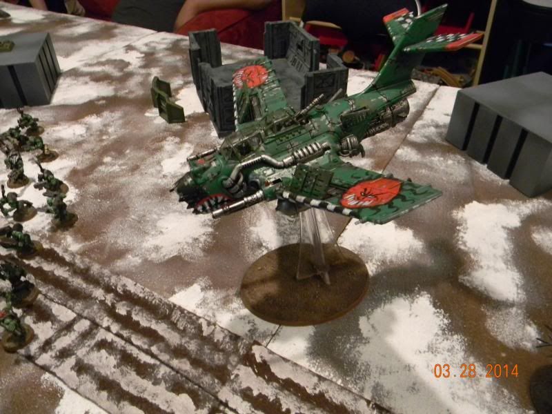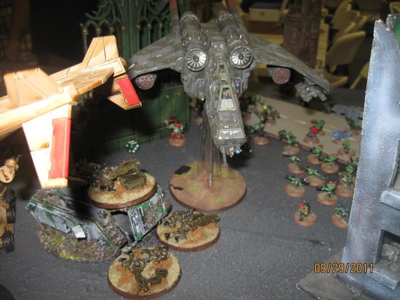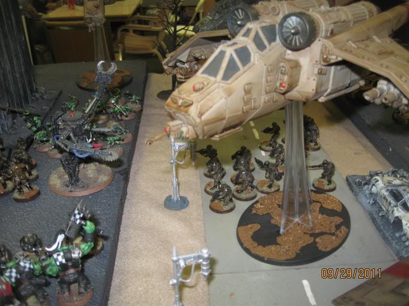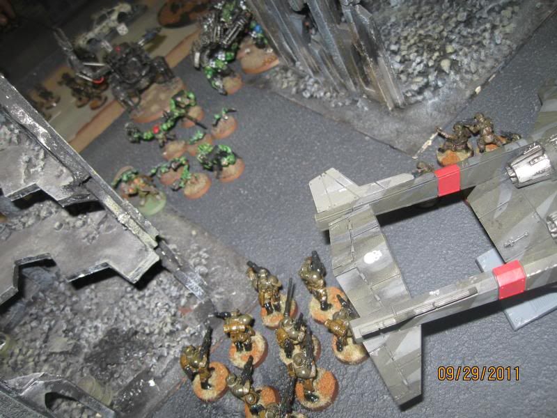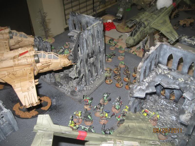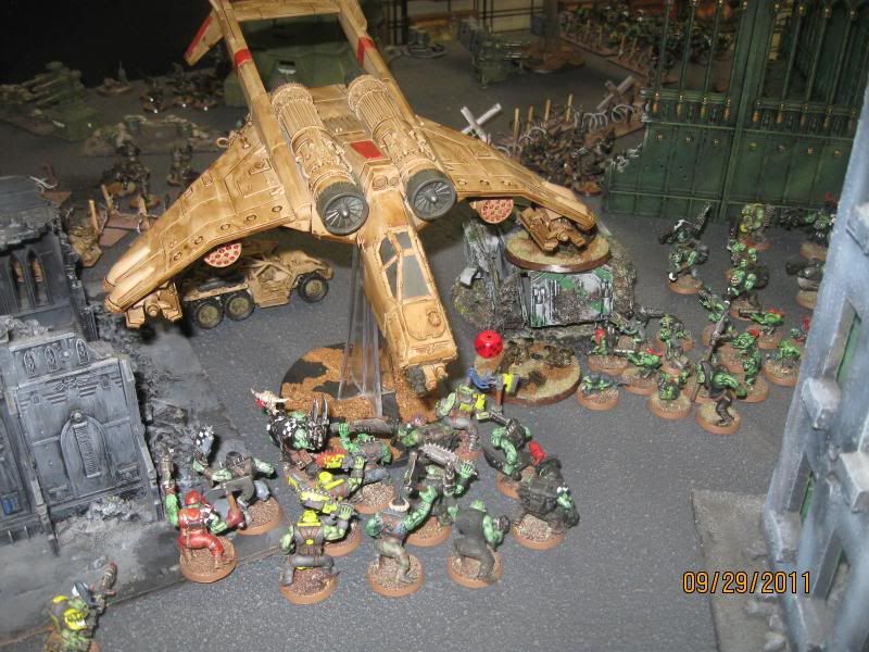its been a while but heres another game in our narative campagin . last time the elite elysian drop troops were flown in to rescue the down governor from his crashed transport . orks quickly swarmed the crash site , but the elite elysians were able to escape rescuing him . before he fell in to xenos hands . the imperial guard valkyrie quickly with some escort fighters flew north to another hive city of Helnore . there the governor could reorginize his last armieds of pdf and begin to fight back . hopefully the distress signal projected by his psychers would be received by a close by imperial force . hopefully help would come , to this planet under seige . open landing at the hive cities space port . the view of thousands of ork bikes and buggies and other strange vehicles could be seen speeding towards the landing zone . preparing to land the pilot yelled " its going to be rough landing , hold on " anti air began shoot up at there drop ships , from make shift ork guns on the ground . then hordes of ork fighter jets could be seen flying out of the skies . all shooting and dive bombing the hive . expolsions and rockets streaked the skies . in the distance large stompas and gargants could be seen moving slowly towards the city . doom was upon them now . then from out of the sky . little fire balls could be seen dropping from the higher altitudes . these werent ork fightas or imperial guard drop troops. these were space marines . the emperor has saved us . the space marine drop pods began to strike the ground below . adeptus astrates here!! the govenor smiled . then from over head a thunder hawk zoomed by , quicky dispacthing a ork jet . the thunder hawk gunship markings were those of the space wolves , by god ! " my lord were about to land!" yelled the crew . door gunners on the valkyrie blazing away on there heavy bolters . firing away at orks on the ground . the drop ship touched down and the battle began . we played a 3000 point small apoc game . 3000 points of orks , mostly in vehicles and 1500 of elysian drop troops and 1500 of space wolves . the table had three objectives the landing pad where the governor just had landed , the space marine statue at the cities entrance and a small patrol base on the edge of the city . who ever had the most objectives within a set time frame one . the orks contrentated on the statue and the out post objectives .very bloody two squads of war bikes brought a lot of fire to bare on two long fang squads . two large units of foot slogers attacked the bases . its defenders fighting as hard as they could . but soon green skins were over the wall in combat . space wolves rushed to clear the orks out . but the numbers were numerous . trucks and battle wagons dumped there orks and nobs to clean up . finally the last squad of marines fought a tactical withdrawl . the base now belonged to the green skins ! mean while at the statue in the middle of the table. orks quickly made it there , but were constanly attacked by elysian drop troops droping in . the LZ was hot but the elite troopers it there drop sites . along side them buggies parachuted into help in the support by elements . constanly firing sowing death and chaos into the ork ranks .a dakka jet screamed in straffing some guard units , but that didnt stop the imperial forces from fighting on . the landing pad was a differnt story . not one ork even tried to get that far . imperial heavy weapons teams and vets dug in waiting for a fight that never came . an guard officer there thought to him self , why didnt the orks attack there? was there a plan or some secret attack on the way...i wonder . the dust settled for an imperial victory the out post being held by the green skins and the landing pad and sacred statue being held by the wolves and elysians . great game enjoy the pics Automatically Appended Next Post:                 Automatically Appended Next Post: