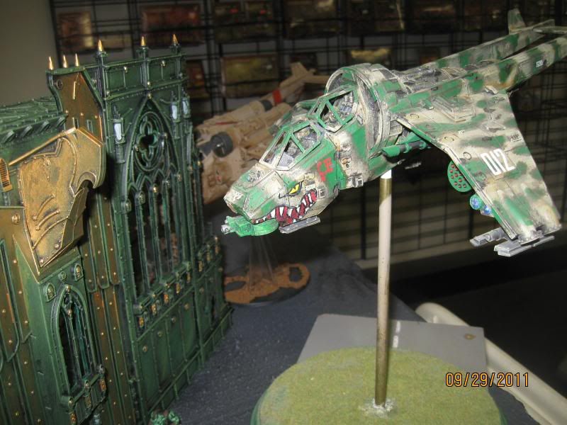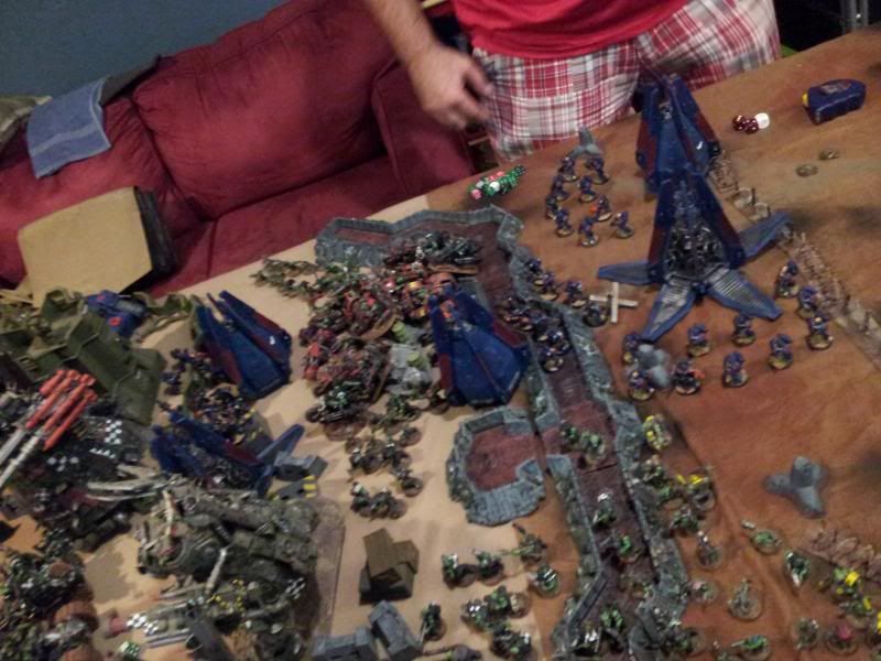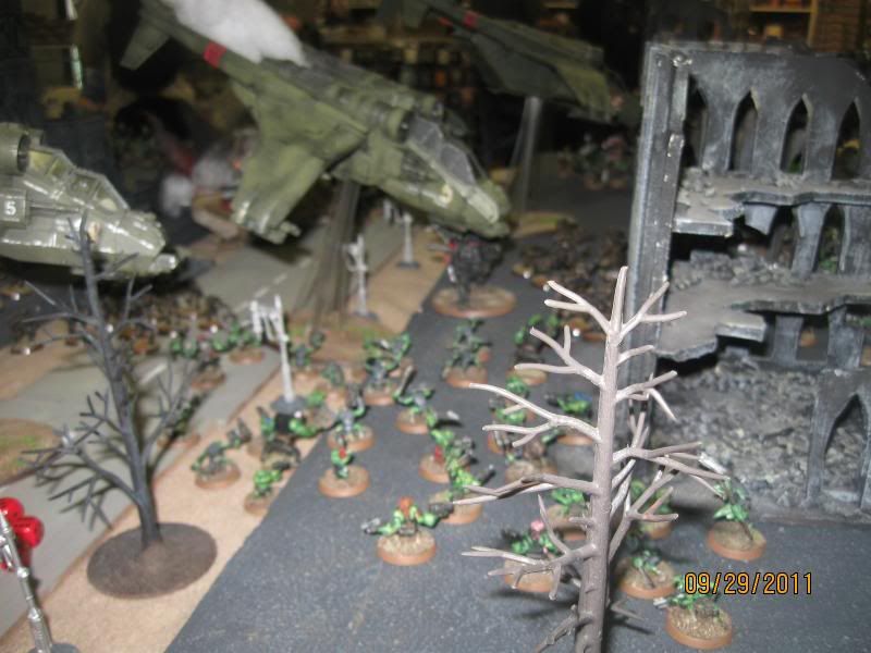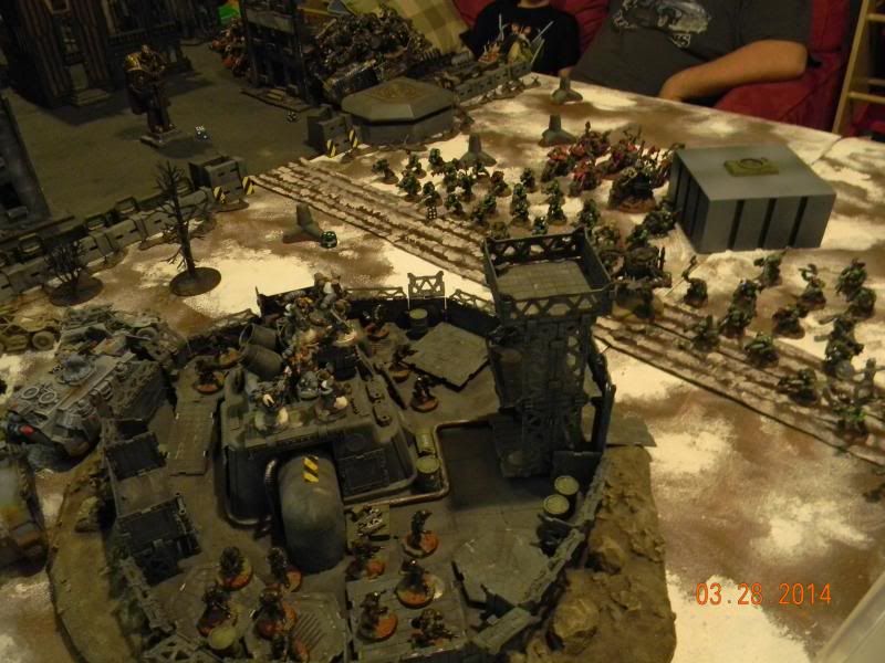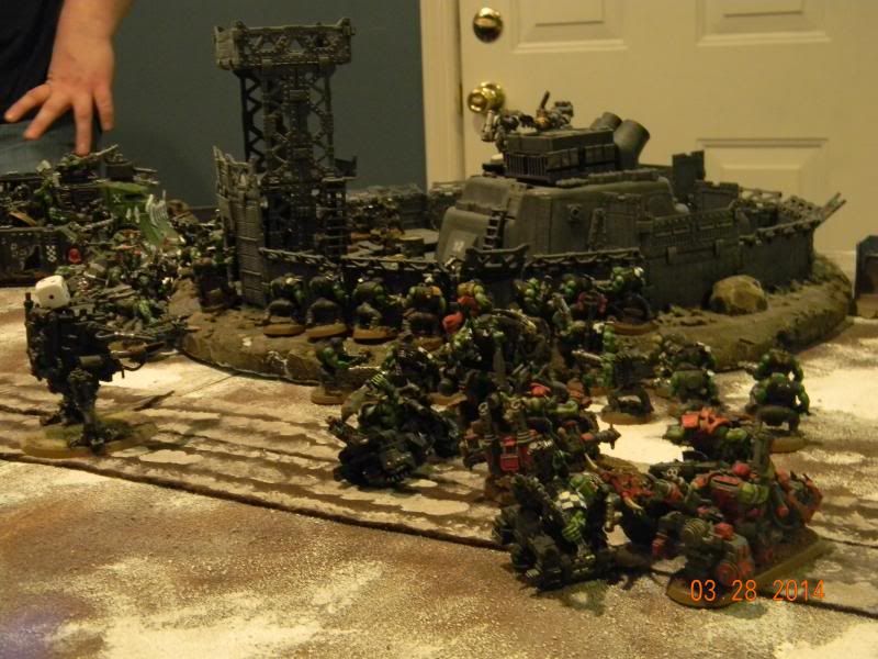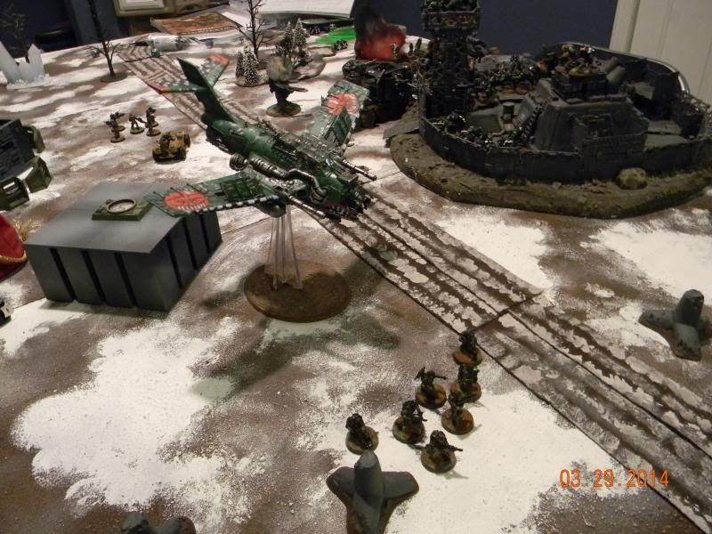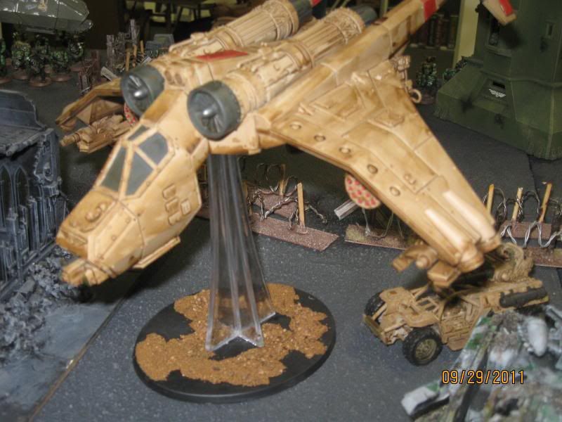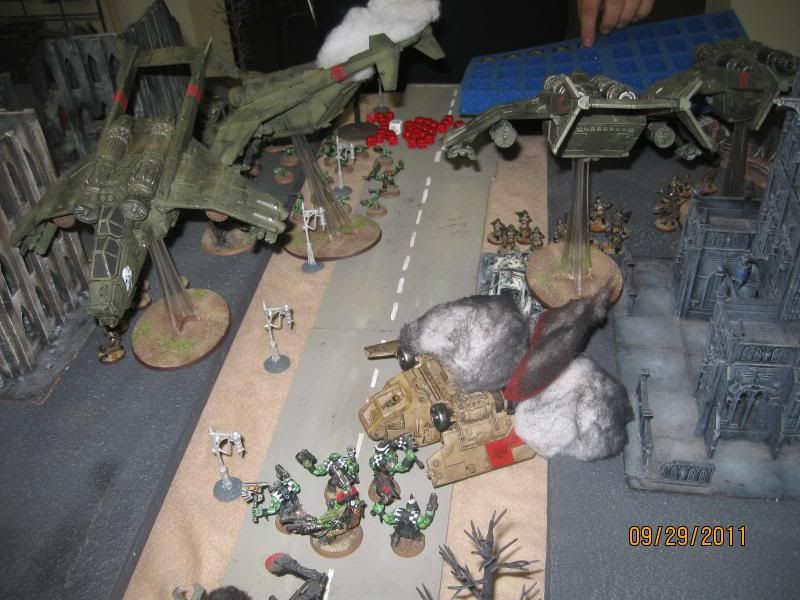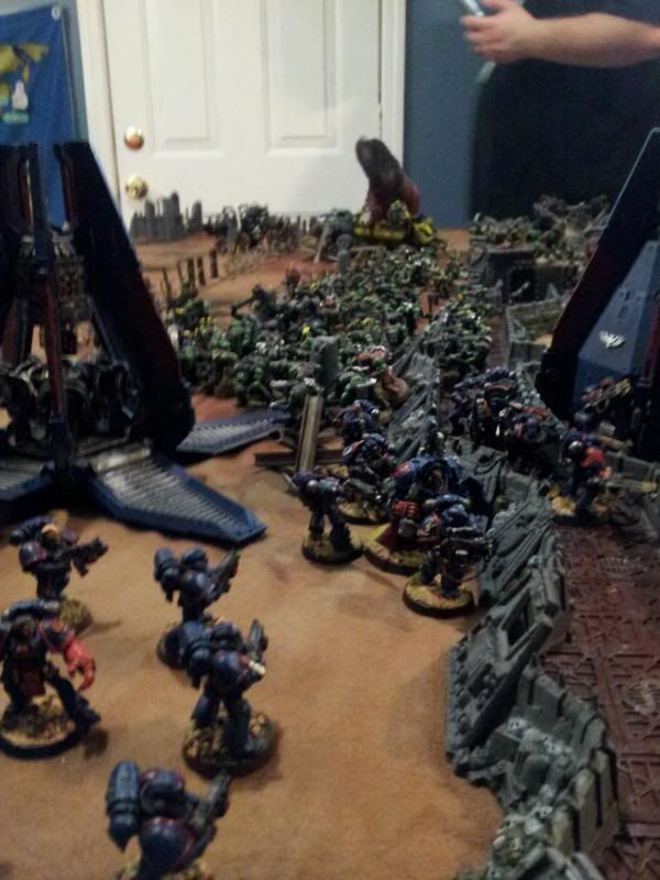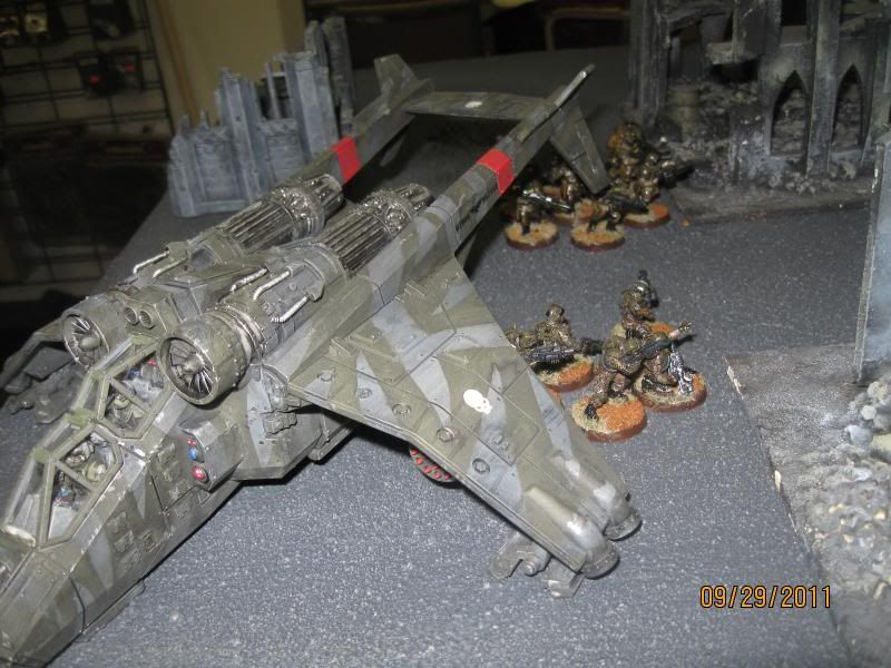 its been a while but heres another game in our narative campagin . last time the elite elysian drop troops were flown in to rescue the down governor from his crashed transport . orks quickly swarmed the crash site , but the elite elysians were able to escape rescuing him . before he fell in to xenos hands . the imperial guard valkyrie quickly with some escort fighters flew north to another hive city of Helnore . there the governor could reorginize his last armieds of pdf and begin to fight back . hopefully the distress signal projected by his psychers would be received by a close by imperial force . hopefully help would come , to this planet under seige . open landing at the hive cities space port . the view of thousands of ork bikes and buggies and other strange vehicles could be seen speeding towards the landing zone . preparing to land the pilot yelled " its going to be rough landing , hold on " anti air began shoot up at there drop ships , from make shift ork guns on the ground . then hordes of ork fighter jets could be seen flying out of the skies . all shooting and dive bombing the hive . expolsions and rockets streaked the skies . in the distance large stompas and gargants could be seen moving slowly towards the city . doom was upon them now . then from out of the sky . little fire balls could be seen dropping from the higher altitudes . these werent ork fightas or imperial guard drop troops. these were space marines . the emperor has saved us . the space marine drop pods began to strike the ground below . adeptus astrates here!! the govenor smiled . then from over head a thunder hawk zoomed by , quicky dispacthing a ork jet . the thunder hawk gunship markings were those of the space wolves , by god ! " my lord were about to land!" yelled the crew . door gunners on the valkyrie blazing away on there heavy bolters . firing away at orks on the ground . the drop ship touched down and the battle began . we played a 3000 point small apoc game . 3000 points of orks , mostly in vehicles and 1500 of elysian drop troops and 1500 of space wolves . the table had three objectives the landing pad where the governor just had landed , the space marine statue at the cities entrance and a small patrol base on the edge of the city . who ever had the most objectives within a set time frame one . the orks contrentated on the statue and the out post objectives .very bloody two squads of war bikes brought a lot of fire to bare on two long fang squads . two large units of foot slogers attacked the bases . its defenders fighting as hard as they could . but soon green skins were over the wall in combat . space wolves rushed to clear the orks out . but the numbers were numerous . trucks and battle wagons dumped there orks and nobs to clean up . finally the last squad of marines fought a tactical withdrawl . the base now belonged to the green skins ! mean while at the statue in the middle of the table. orks quickly made it there , but were constanly attacked by elysian drop troops droping in . the LZ was hot but the elite troopers it there drop sites . along side them buggies parachuted into help in the support by elements . constanly firing sowing death and chaos into the ork ranks .a dakka jet screamed in straffing some guard units , but that didnt stop the imperial forces from fighting on . the landing pad was a differnt story . not one ork even tried to get that far . imperial heavy weapons teams and vets dug in waiting for a fight that never came . an guard officer there thought to him self , why didnt the orks attack there? was there a plan or some secret attack on the way...i wonder . the dust settled for an imperial victory the out post being held by the green skins and the landing pad and sacred statue being held by the wolves and elysians . great game enjoy the pics Automatically Appended Next Post:                 Automatically Appended Next Post: