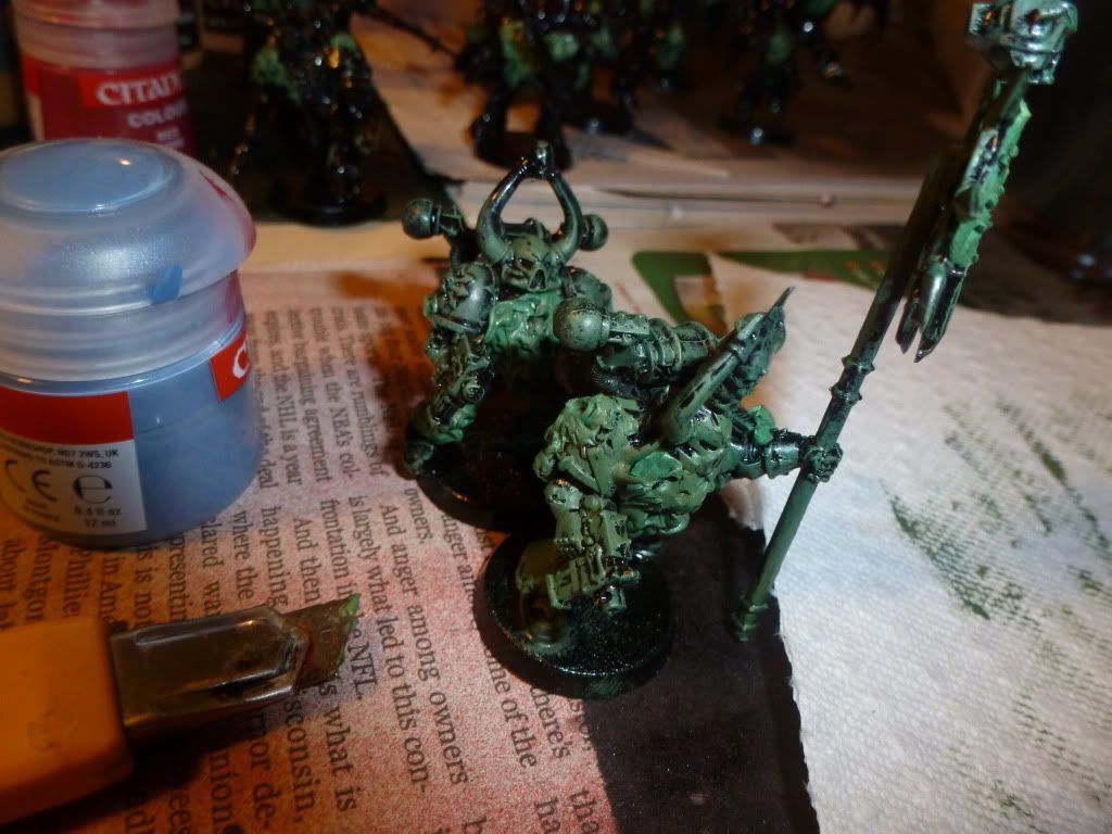 You might like to try some washes - browns, reds and pus-like oranges - to add colour to the green areas and make them look suitably infected. (This is also a great way to distinguish green painted equipment from rotten green flesh.) It's very difficult to overdo the seeping yuk with Nurgle, so you can afford to be bold and experimental!