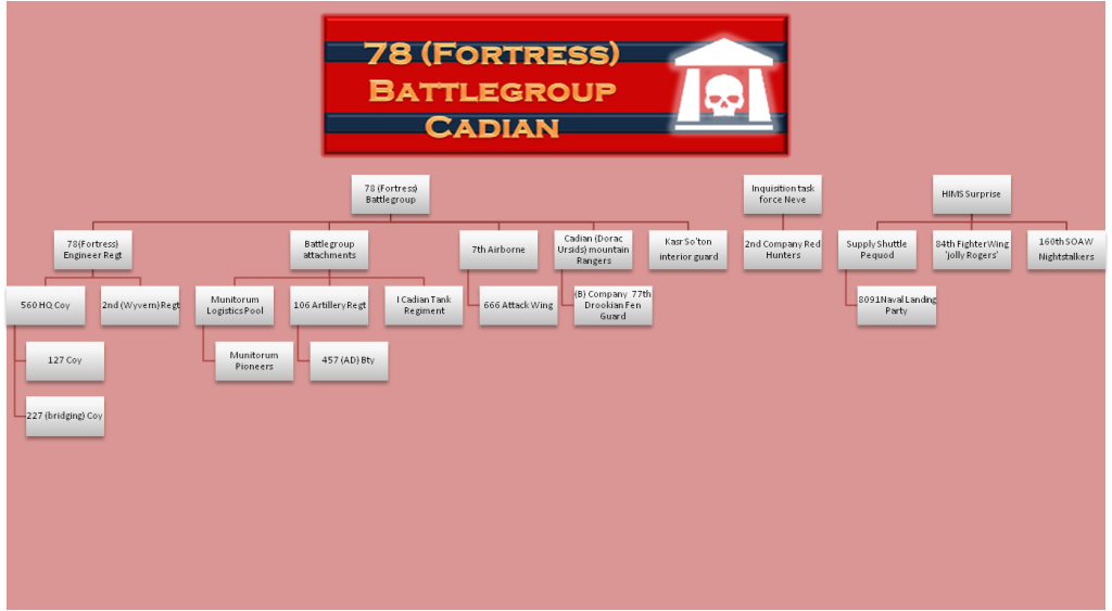 This is the battlegroup order of battle. There have been a couple of changes since I first did this. The Lighting squadron has been redesignated for example and some of the units dont yet exist. I Have one solitary Jouran Dragoon- always loved Storm of Iron and they are listed in the Eye of Terror codex as are the Drookian Fen Guard. I will be getting some of the Victoria Lamb conversion kits for that.