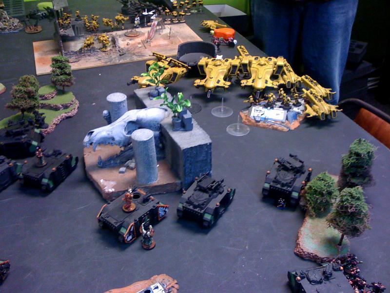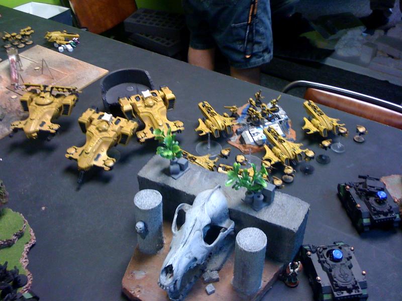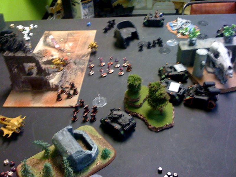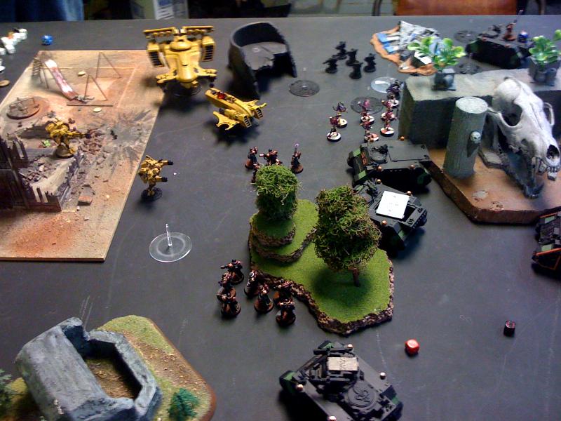I deployed all my stuff before seeing him finish pulling out all of his models. I did see the horde of piranha and assumed they all had fusion blasters. But I was surprised by the lack of heavy support, 2 broadsides and a sky ray is just really light for Tau. I actually blurted out, after he set up, something like "Wheres your anti-tank". If you think that was light anti-tank you should see my next opponents list that I'll try to write the batrep up for over the next week or so. I'm not sure who I would say had more anti-tank, probably the de player, but only by a little bit.