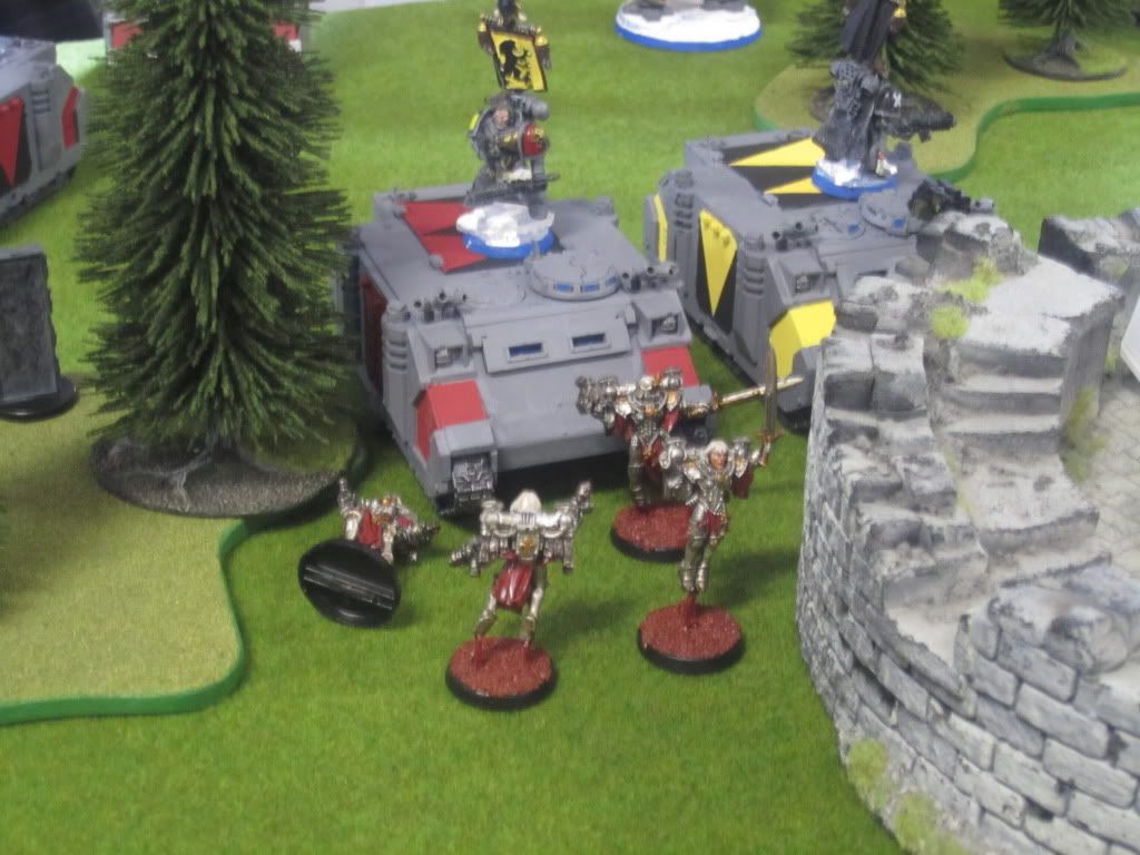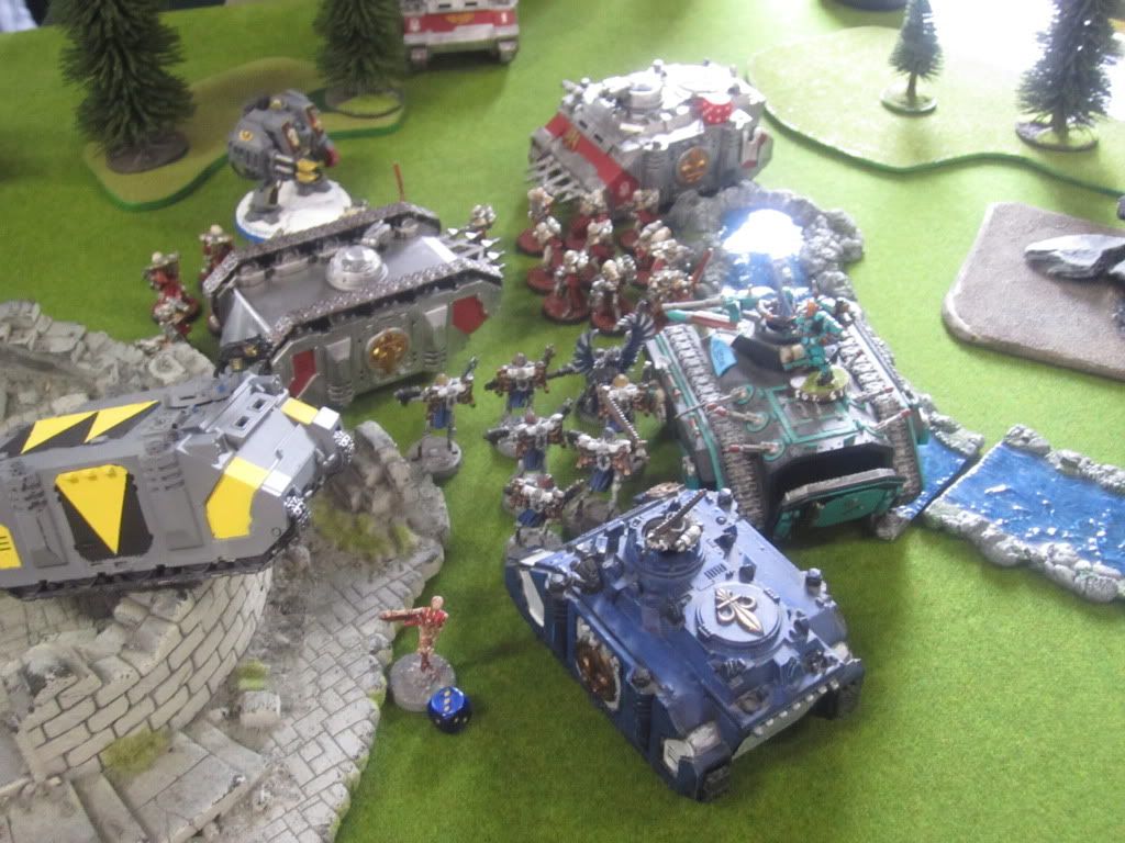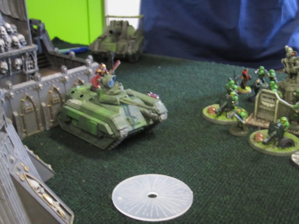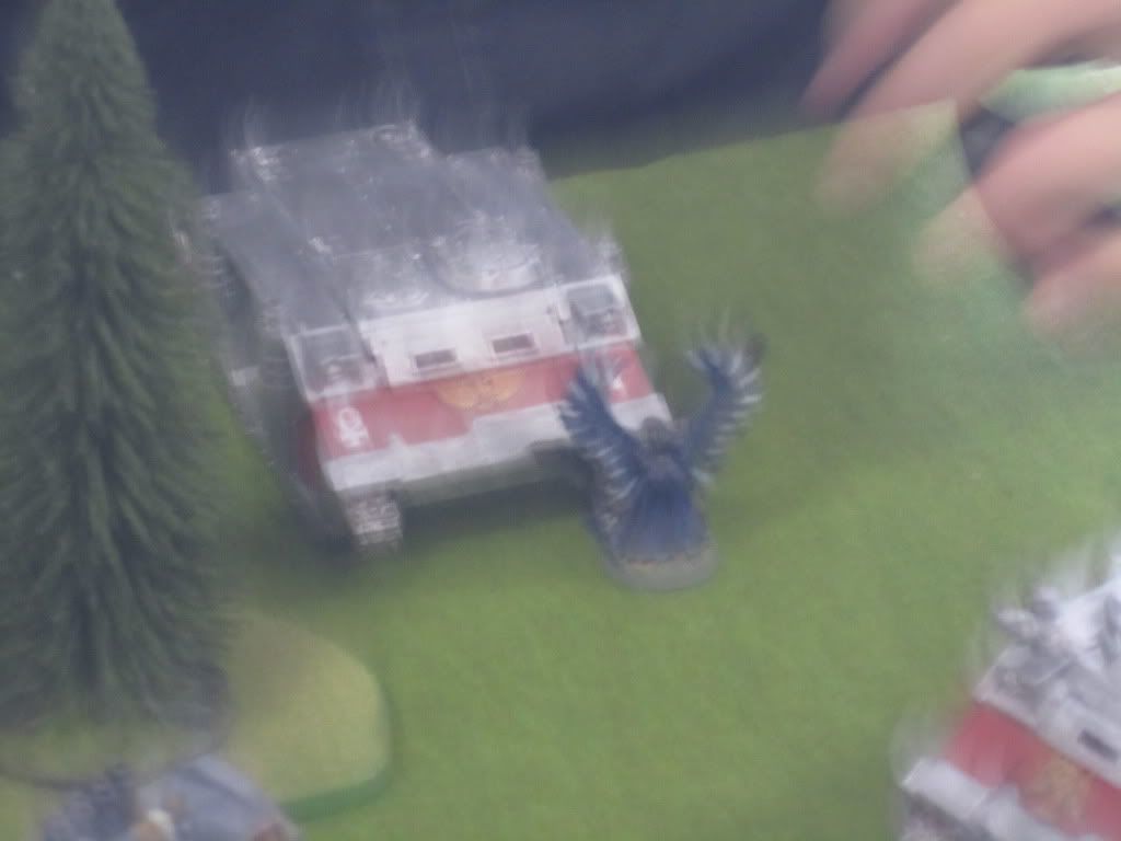 The forces of the Imperium won the first turn, and we wasted no time in advancing. In the centre of the board, the Command Chimera, Hellhound, Immolator and one of my Rhinos Rhino all advanced towards the centre. The Seraphim, seeing that there wasn’t any deep-striking threat to worry up, flew up behind the advancing Rhino wall. One of my Rhinos skirted around the right flank towards the rightmost objective, along with the Veteran Chimera,, while the Canoness flew up the right flank to hide behind a large rubble pile. The Russes and the Basilisk, meanwhile, held their positions, content to unleash pie-plated doom on our opponents.