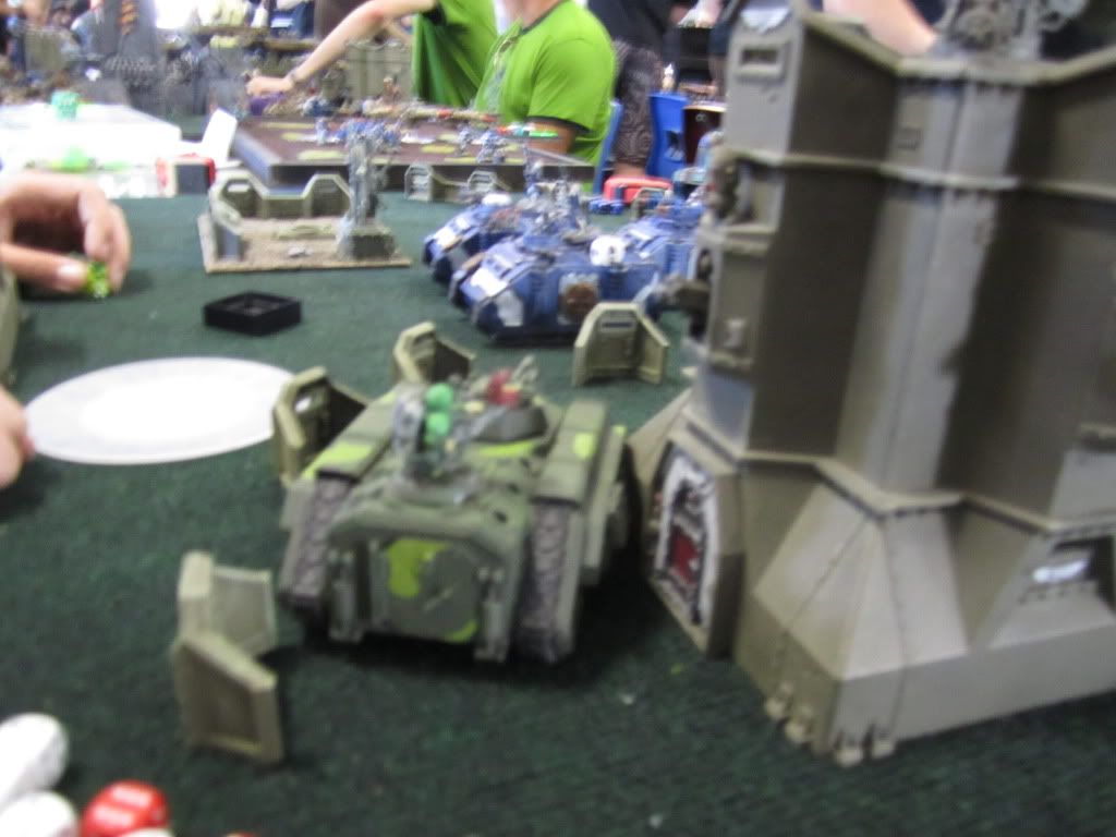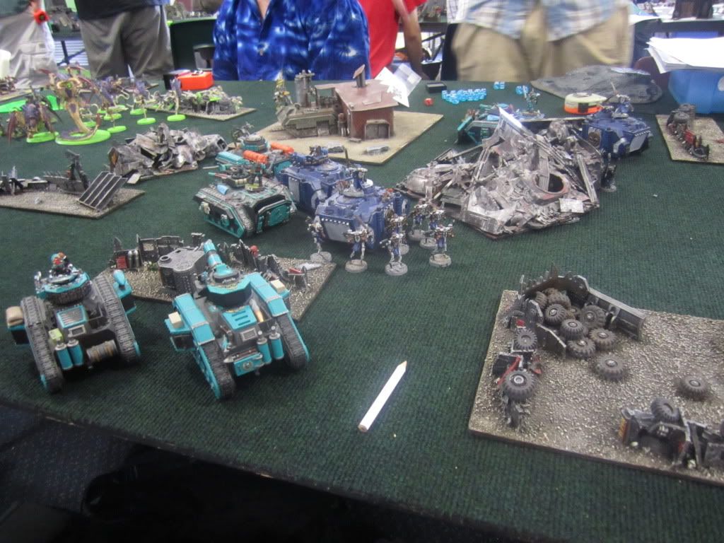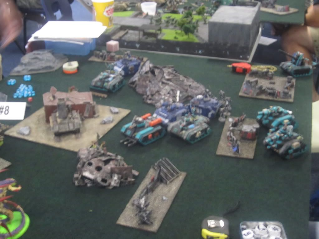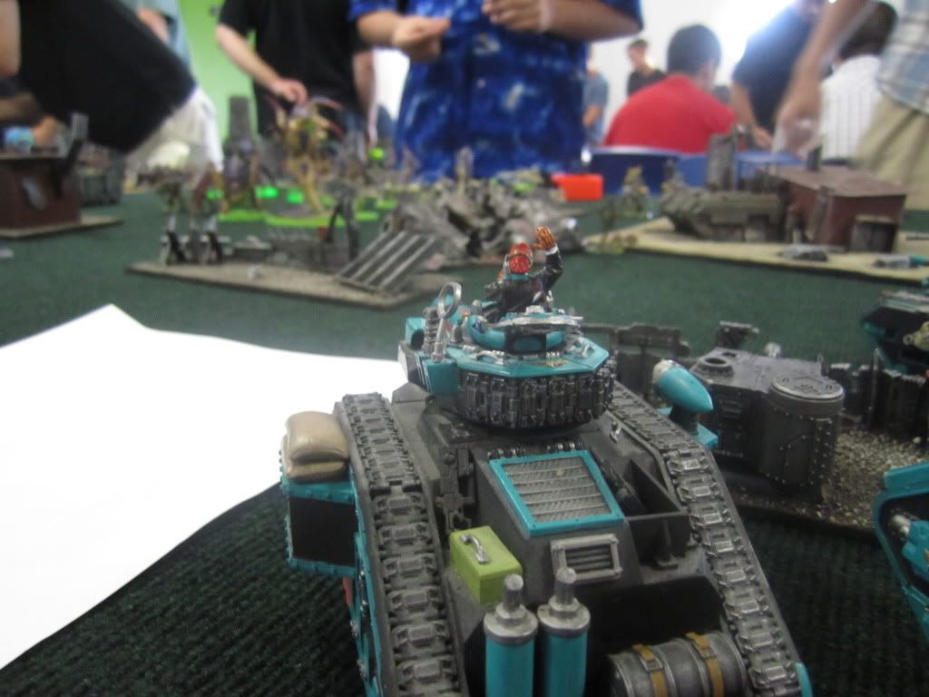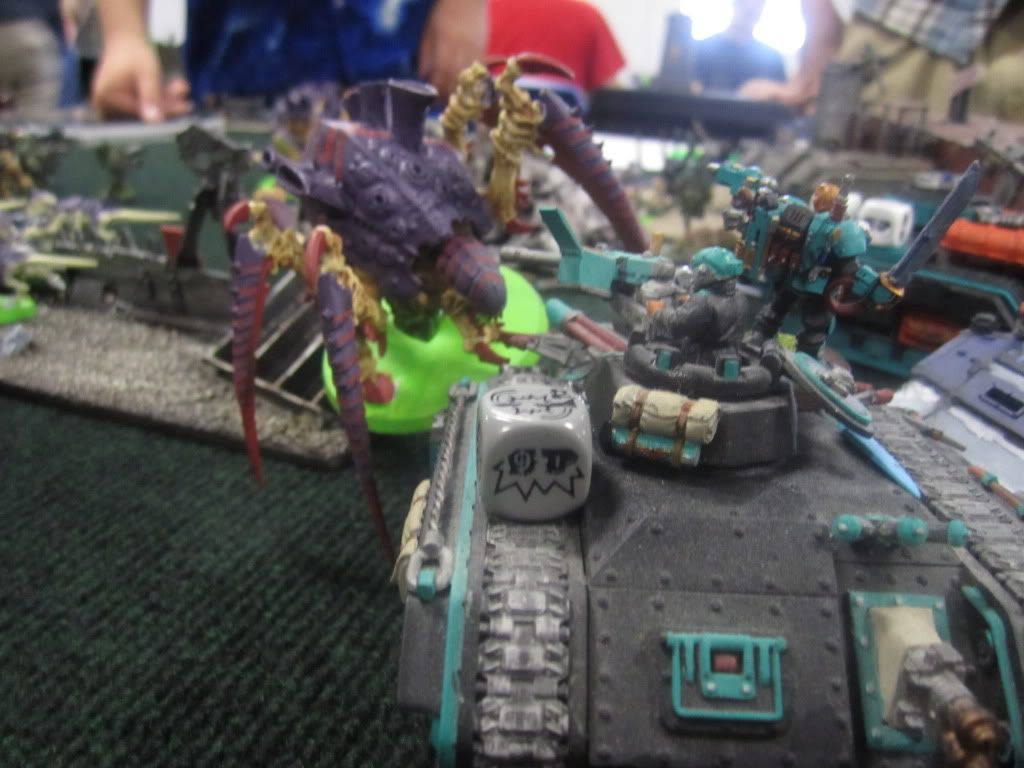 At this point, though, the tournament organizers declared that round three was almost at an end. We were all surprised and a little disappointed, as we didn’t think we had been taking that long, and the game was so tense that we all wanted to keep playing. Sadly, we had to tally up the points to see who had won. As it turned out, we won on primary, holding the 3-point marker and contesting the 1-point marker while Chaos held...well, nothing. Similarly, we won on secondary with four kill points to three, though if I remember correctly, the Chaos/Tyranid said narrowly won tertiary by holding one terrain piece to our zero. Even so, although the game had ended too early for anyone’s liking, the Imperium had come out ahead.