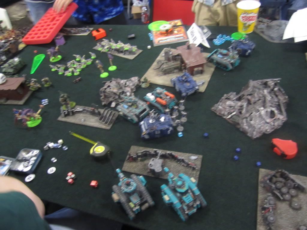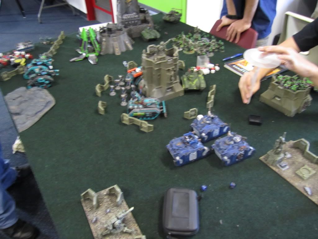 The team tournament was fairly large, with 50+ players and a myriad of armies involved (with the most common ones being Grey Knights, Blood Angels, Dark Eldar and Tyranids). There would be 4 games, and each side would consist of two 1000 point armies. Maxis and I decided to bring Imperial Guard and Sisters, respectively, as that would give us some decent theme points. Neither of us had time to make any impressive conversions or display boards for the tournament, so we more or less figured we’d miss out on a lot of appearance points. However, that didn’t matter, as we were more or less hoping to do well on actual battle points.