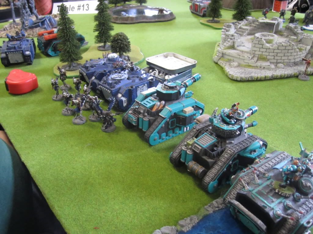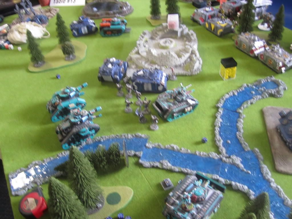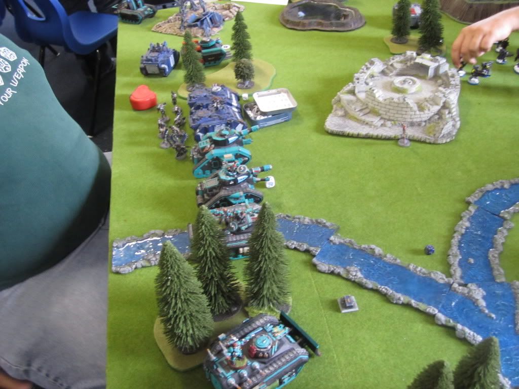 The rest of the enemy reserves came on from the back, with the Medusa trundling onto the field just behind the Company command Squad, and the Chimeras holding the Platoon Command and the Psykers rolling up down the middle. Everything else was in reserve. With nothing to shoot at, the miffed Marines and Guardsmen sat down and began to play euchre, hoping that the enemy would hurry up already.
