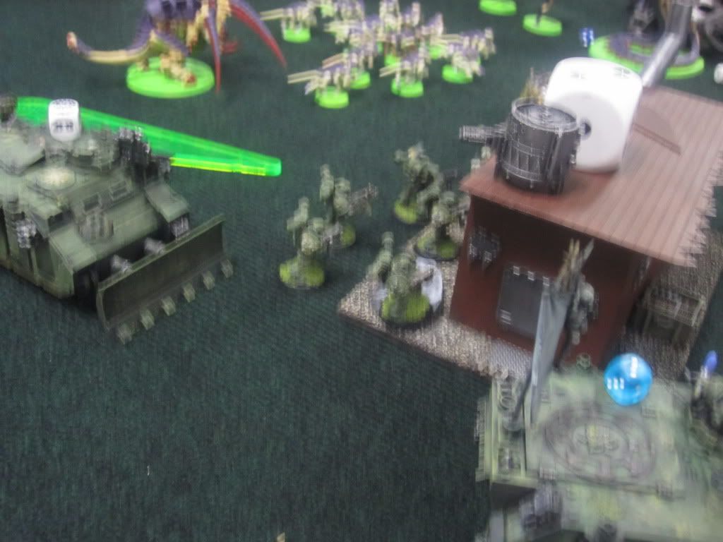 With the Trygon sitting directly in front of our entire army, it would have been rude not to fire everything we had at it. The Russes, the Company Command Squad and the Chimera all opened fire, and after an intense round of melta, battle cannon and small arms fire, the Trygon finally fell as the heavy stubber took its final wound. Score!