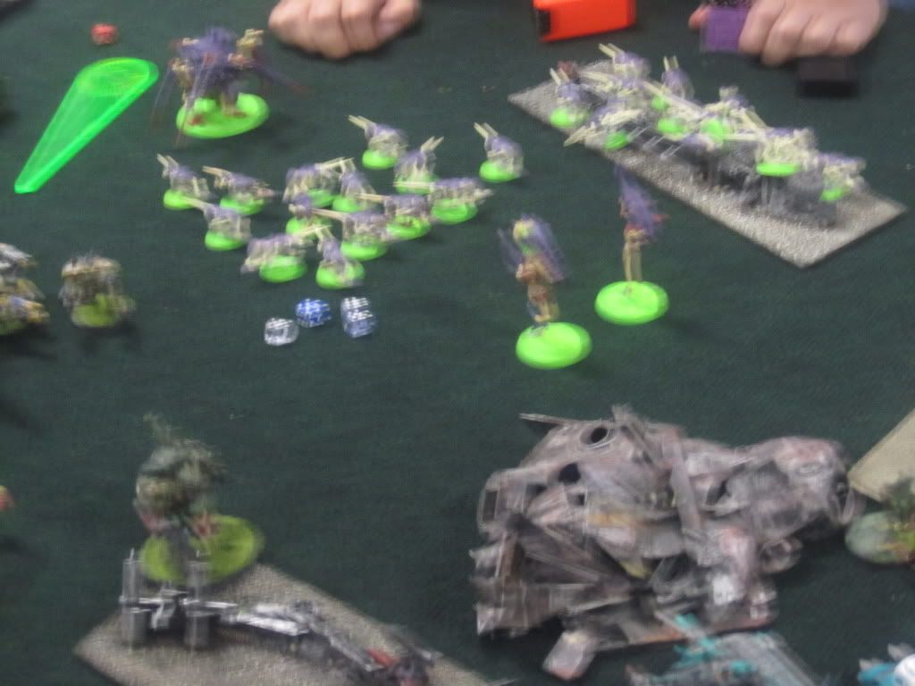 After the disaster of the previous game, we were prepared to do a lot better in the next game. Our next opponents were a pair of really great guys fielding Chaos Space Marines (Death Guard themed) and Tyranids. The Chaos Space Marine player, in particular, had taken the fluffy approach of naming his army the Death Guard Second Company, and his Daemon Prince Ignatius Grulgor for some Horus Heresy tie-ins. Its a pity I couldn’t take a non-blurry picture of their display base (the Death Guard being ambushed by Tyranids), as it was really well done.
