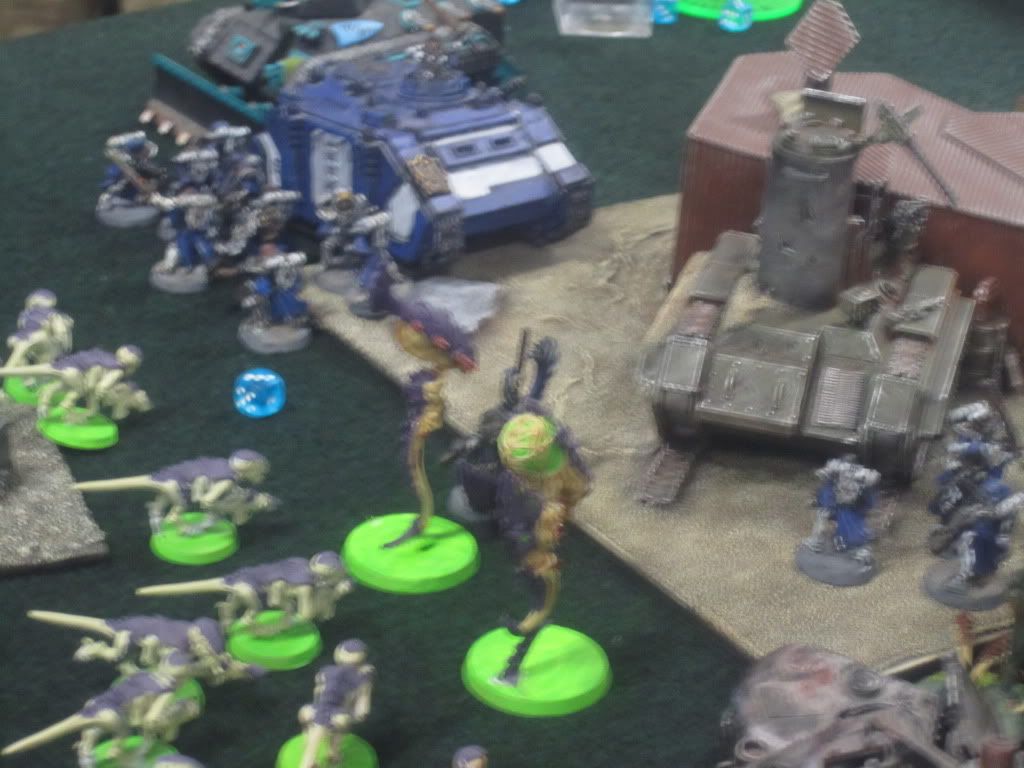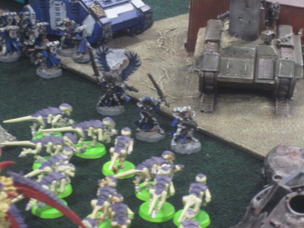 Elsewhere, my northernmost Battle Squad finally zoomed up and disembarked in front of some surprised Termagants, while the Celestians advanced resolutely towards the Zoanthropes, along with Merced, who flew up from behind the shed to get some action. Finally, near the back of our lines, the Veterans disembarked to secure the 3-point objective, while their Chimera edged up to be useful elsewhere.