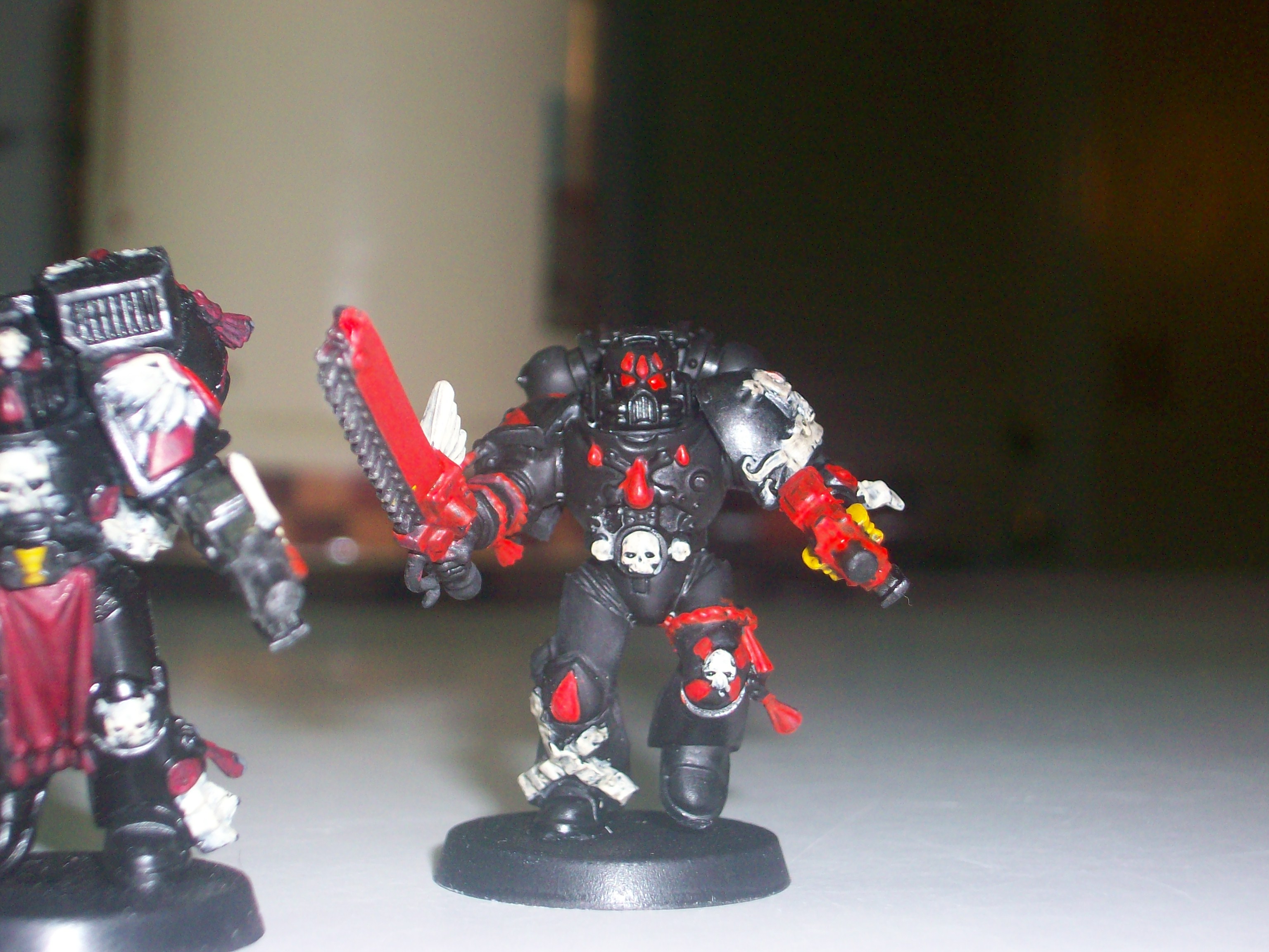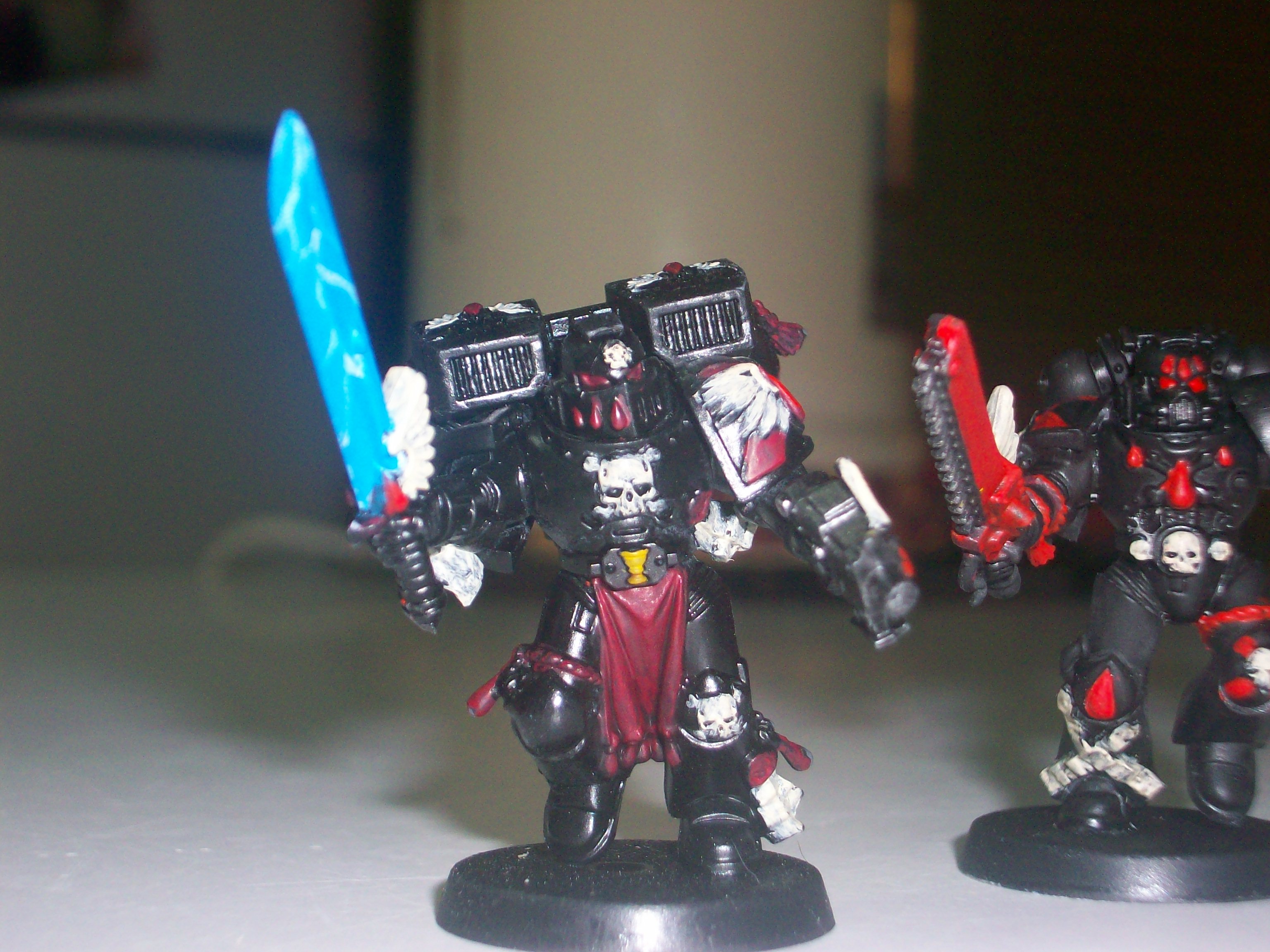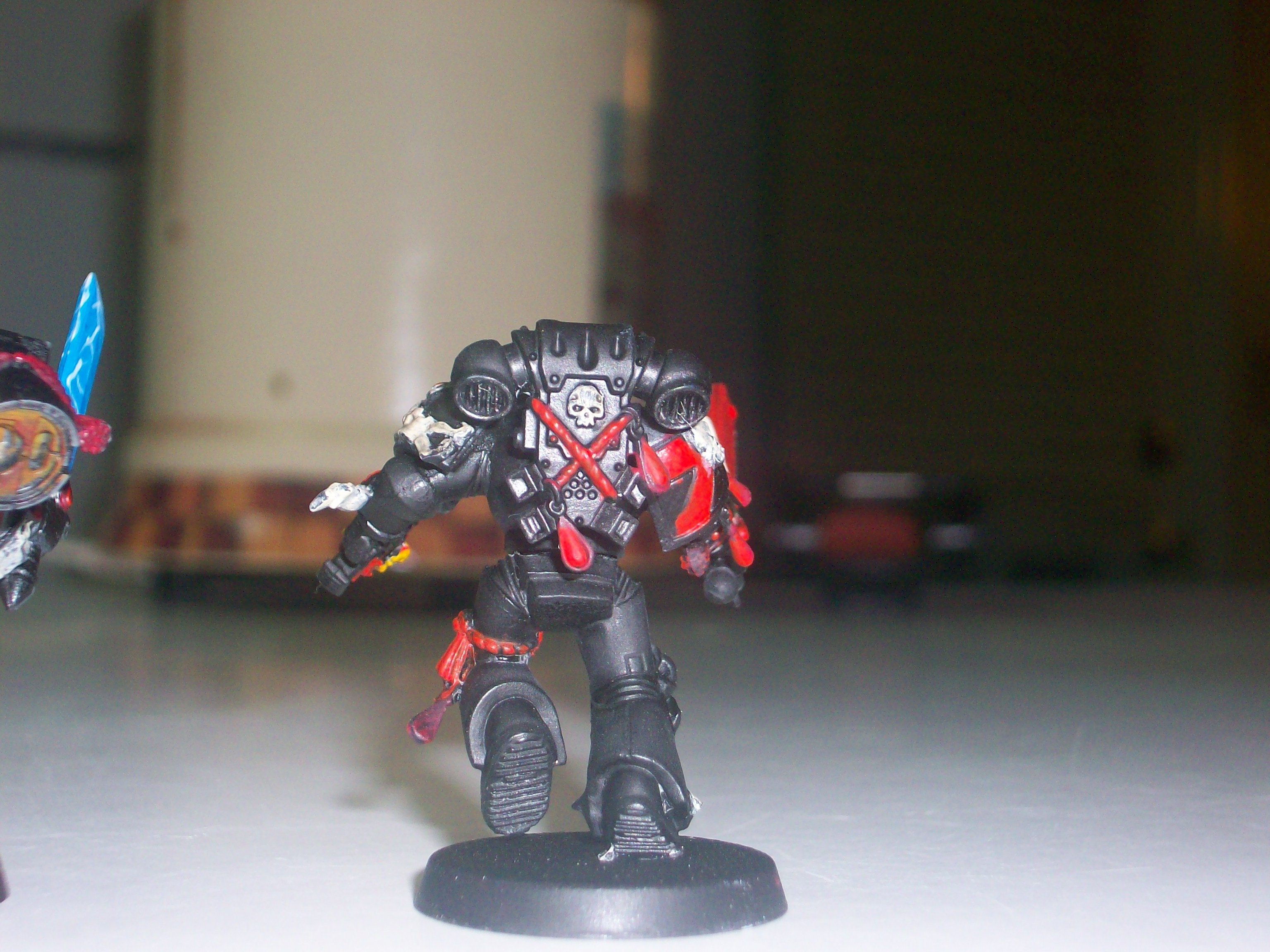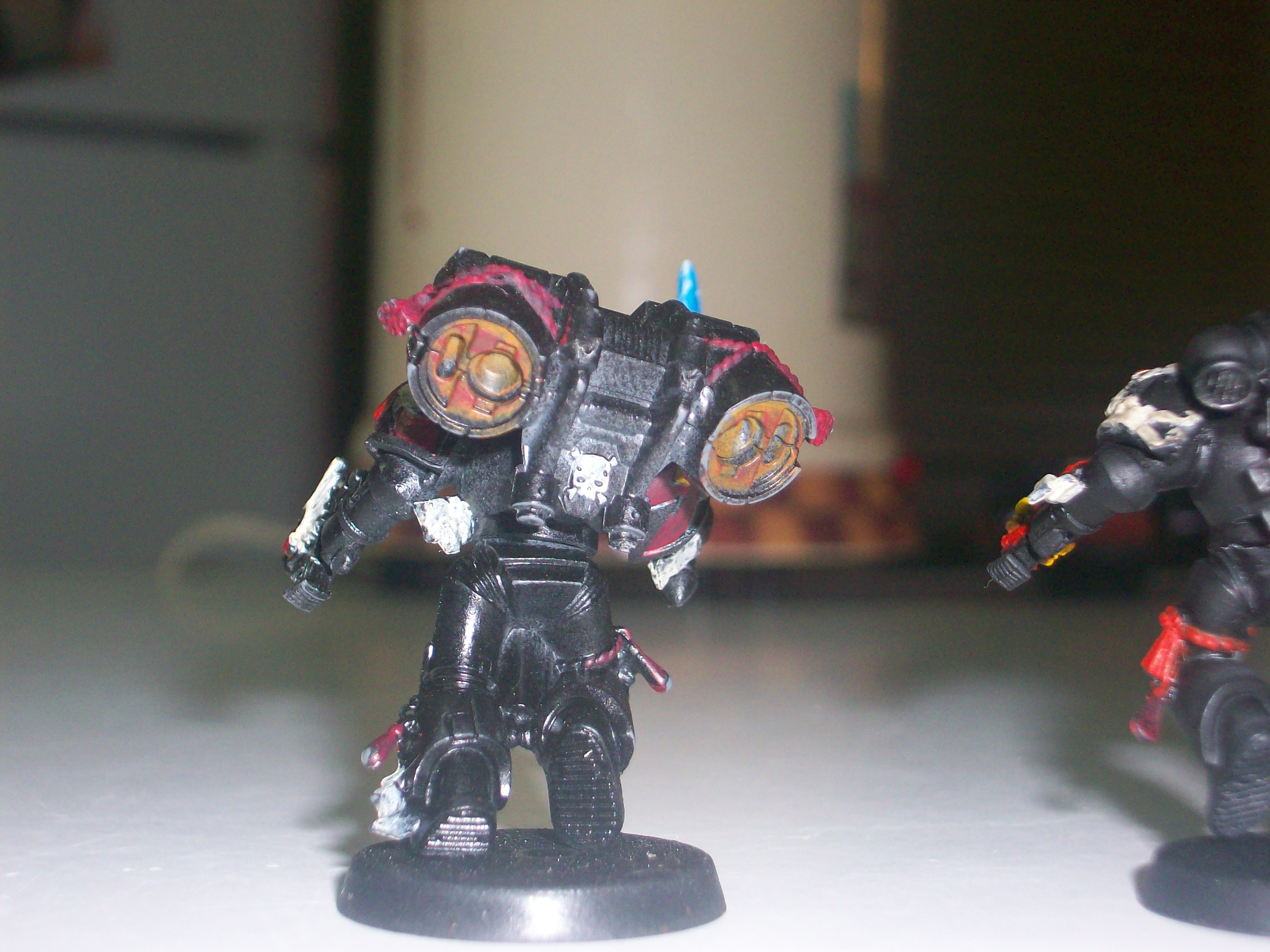 The neatness and attention to detail for your first bits of work is great. My feeling is that black at the moment is a little flat. A useful technique I've found for getting a black with depth is to basecoat Adeptus battlegrey, then wash heavily with badab black. After a layer or two, you get real depth in the crevices, and the grey auto-highlights the ridges because the wash doesn't stay on it very well.