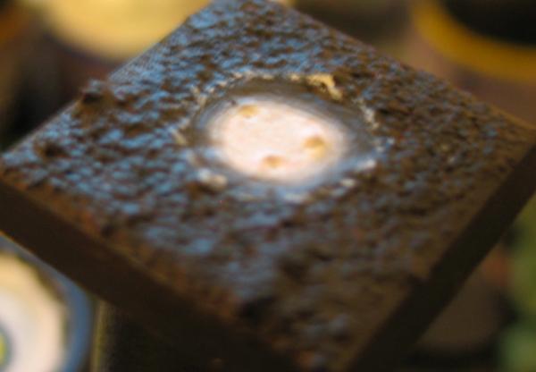 Mixture of baking powder, PVA and water used to build up snow. Water Effect painted on the ground next to it to represent meltwater; not letting the 'snow' dry first seems to have caused a ring of white residue. Skull White and Ice Blue added to snow mixture and painted on top. Middle of lava blended to a light orange.