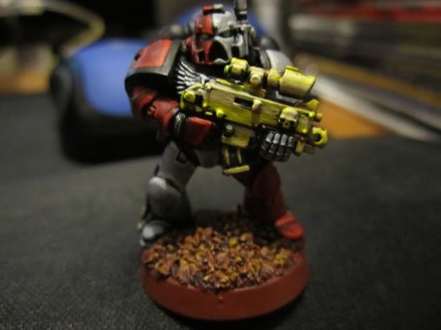 I painted my first assembled marine which I did physical damage too and stayed more towards the original scheme I had in mind before I test painted anything. Meaning some metallic gold. Sorry if the pics suck, I don't know where to take pics for good lighting.