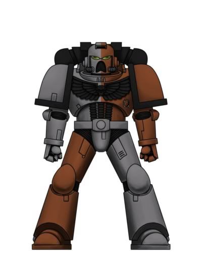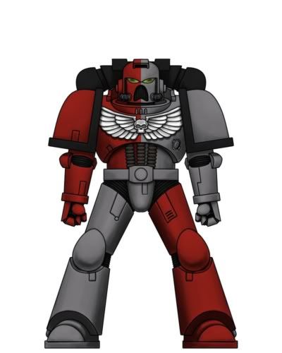 A. Here is the scheme 1 with the paints used (terracotta and cold grey), Totally different real paint wise but just funny to see how dull it looked on the painter. (well actually looks kind of cool but more pre-heresy kind of scheme in my eyes and not blood angels quality).