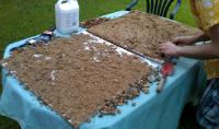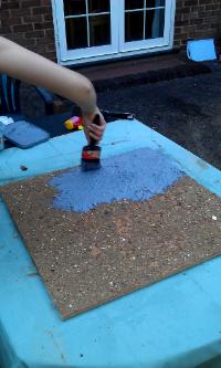 We brushed pure PVA glue onto the boards ready for pouring the ballast on. Some people might used watered down glue for this part, but our ballast was rather coarse with some larger stones in, so the stickier the better. The day was rather hot so drying wasn't an issue. It doesn't look like it, but I swear the sun shined all day!