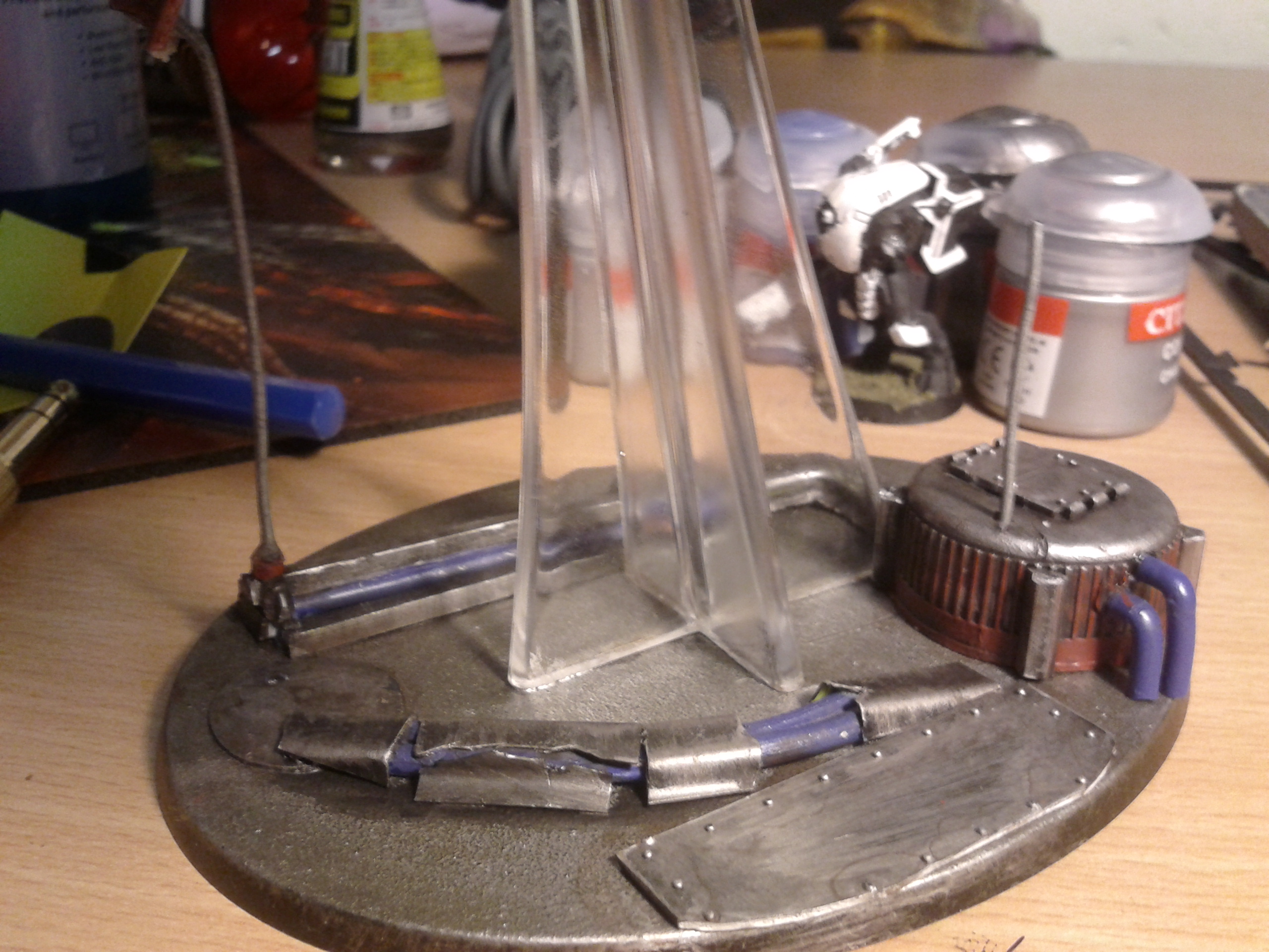 Hey all, this is my first attempt at large base scenery, it's made with sprues, a coke lid and some stereo wires i found, also a bit i found in my box