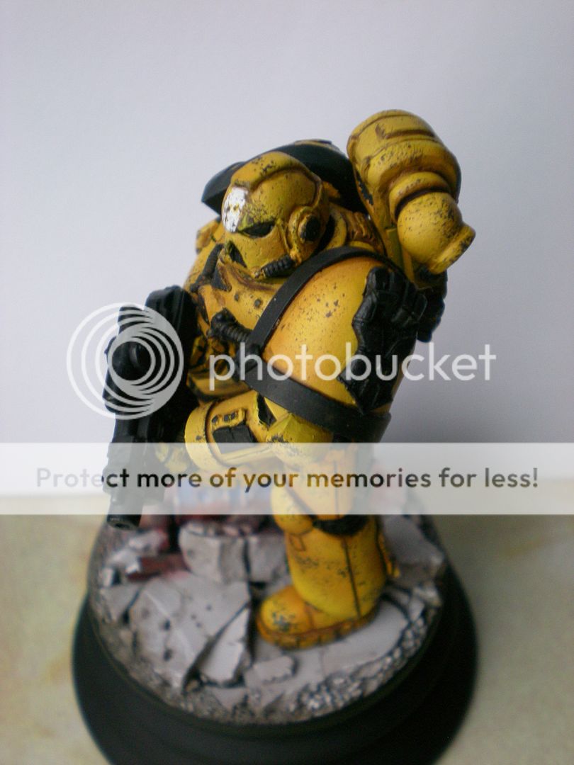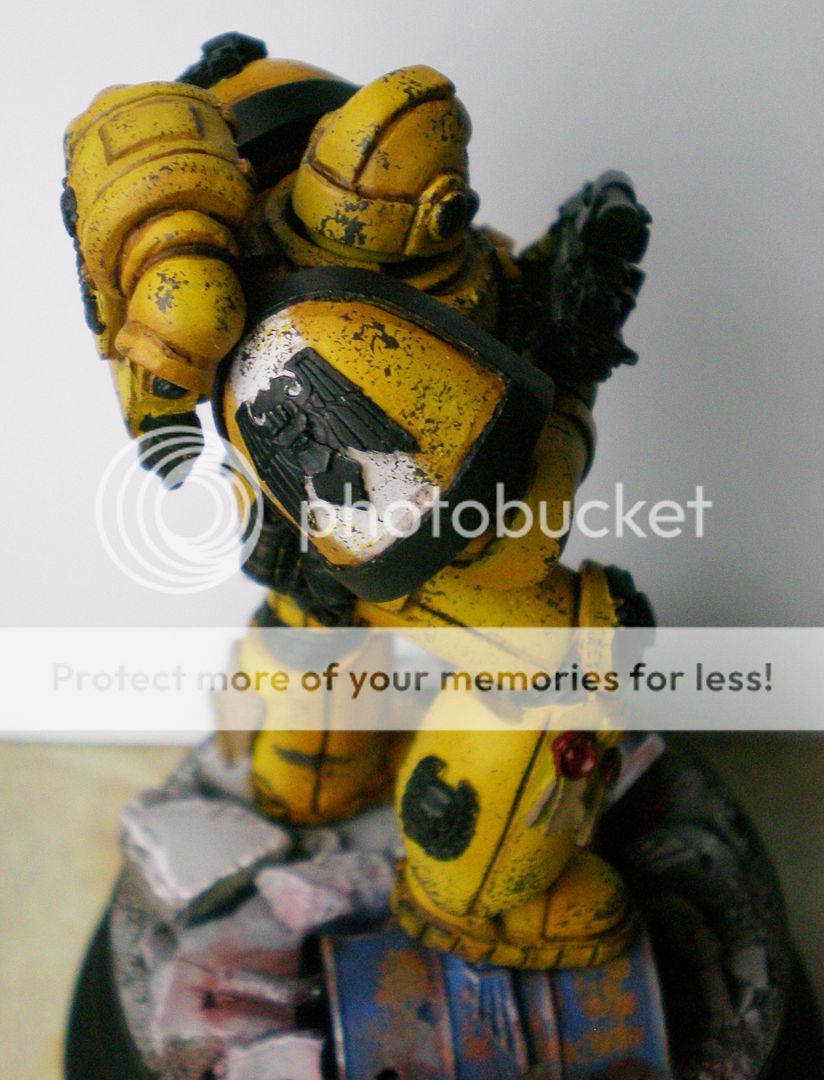 He is painted with my airbrush and I can make a quick and easy tutorial if anyone's interested in my recipe for the yellow. The armor chipping is done with the sponge technique and it still needs some highlights before it's done.