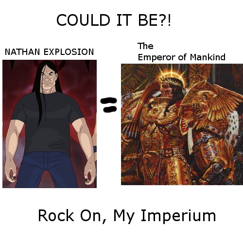 People Thought To Be The God Emperor Of Mankind 1: Conan The Cimmerian: Deep in the Hyborian Age, a man was born in the crude wastes of Cimmeria(a region known by many names throughout history); he would go on to fight in many wars, slay Daemons, and eventually become a king by his own hand. Evidence: This is The Emperor while This is Conan The Cimmerian. In addition, Conan constantly fights demons, and Robert E. Howard's stories lent a good bit to Warhammer Fantasy. Finally, Conan at one point envisions himself "Sitting on a Golden Throne with a Lion Banner Flying Above" (even the Emperor can change his favorite animal.) 2: Any number of religious figures: Really, anyone could be the Emperor putting up an act, but figures such as Moses and Jesus are some of the most likely ones, considering the Emperor would love to bolster his influence. 3: St. George: Specifically the St. George who fought the Dragon, this was in fact the Emperor fighting and imprisoning the Void Dragon on Mars Evidence: Outright stated in that one story about "The Guardian Of The Dragon" 4: Buckaroo Banzai: Brilliant brain surgeon, racecar driver, musician, experimental physicist, and omniglot, Buckaroo Banzai is mostly known for his development of the Oscillation Overthruster in our time. This device, which allowed vehicles to travel through solid matter "by way of the eighth dimension" was actually an early Warp Drive. The Red Lectroids were Warp Creatures attempting to escape the warp. Approximately one thousand years later, The Emperor assumed the name of Buckaroo Banzai once again, as a Battlemech Pilot and Test Driver, providing the groundwork for the Emperor's great later forces, the Titans. Evidence: Buckaroo Banzai simply could not have learned and accomplished all that in half a lifetime, especially the multiple PhDs. The Oscillation Overthruster is again, a Warp Device. Both Banzai's work on Battlemechs(proto-Titans) and his being alive a thousand years after he ought to be are evidence. (Sources: "The Adventures of Buckaroo Banzai: Across The Eighth Dimension, Battletech source material)