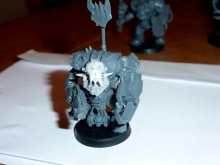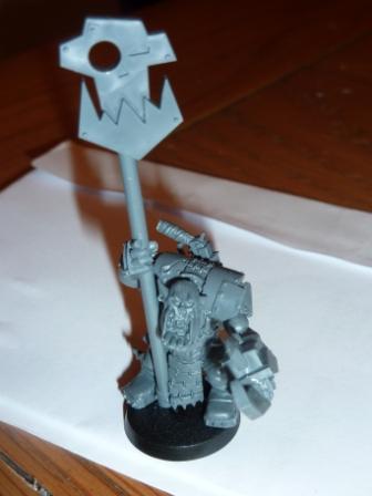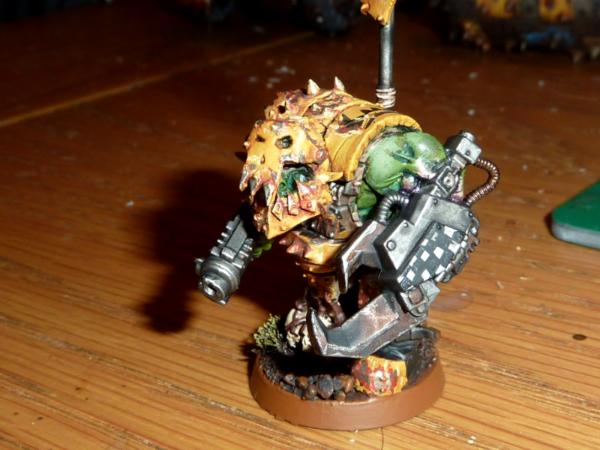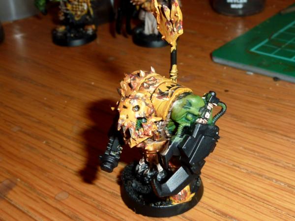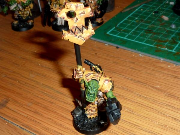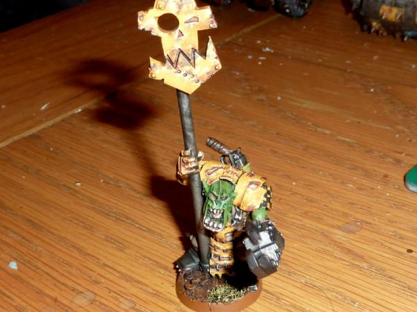 Nob with Waaagh Banner. After taking the picture i noticed the odd looking patch of skin on his cheek and corrected it.