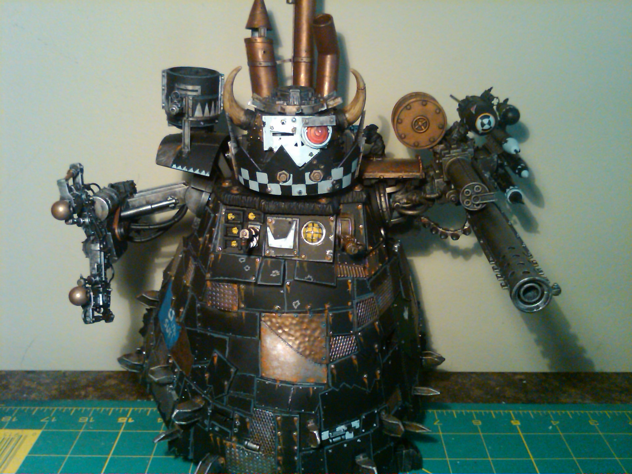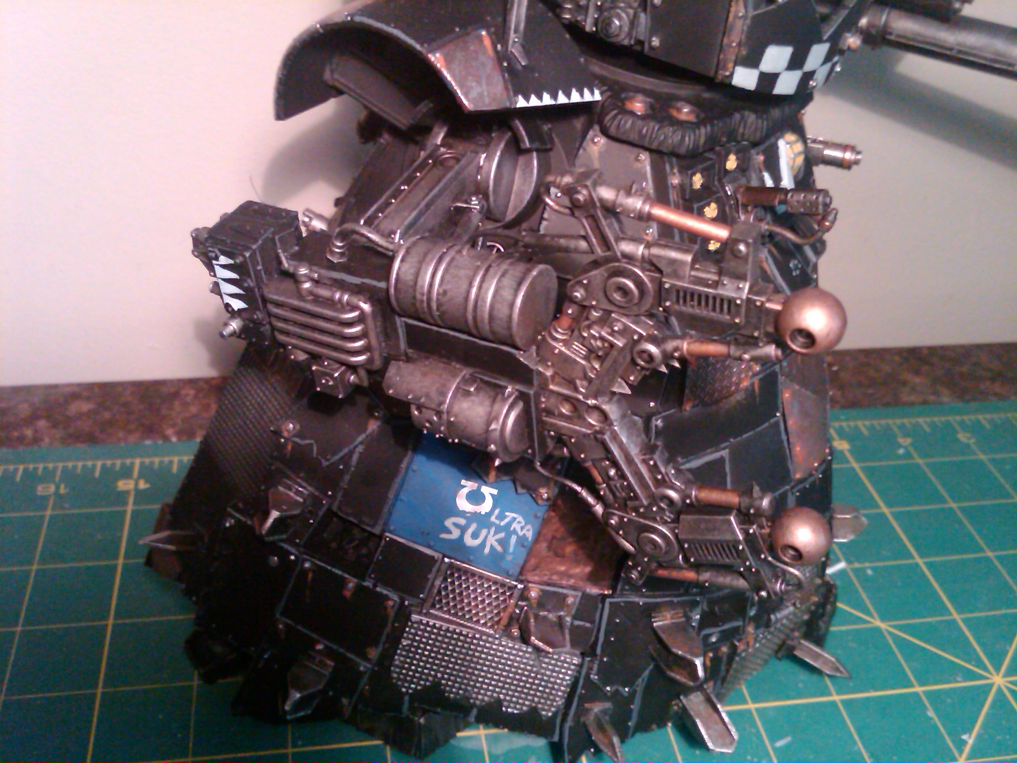 Heres a pic of my big mek stompa thats almost done. the big eye represents the gaze of mork and the right arm is a lifta droppa. for that i cut the saw off and used two deff dread arms to give it a look like they are two tesla coils that zap out energy to pick up enemy vehicles and chuck them. i'm going for a black goff theme but im gunna add more colored pannels in the front to liven him up more. notice the "ultra suk!" added on by grots that used rhino scrap metal