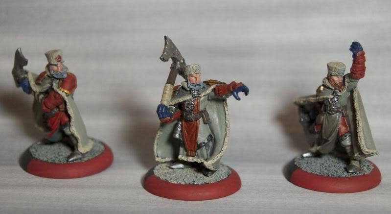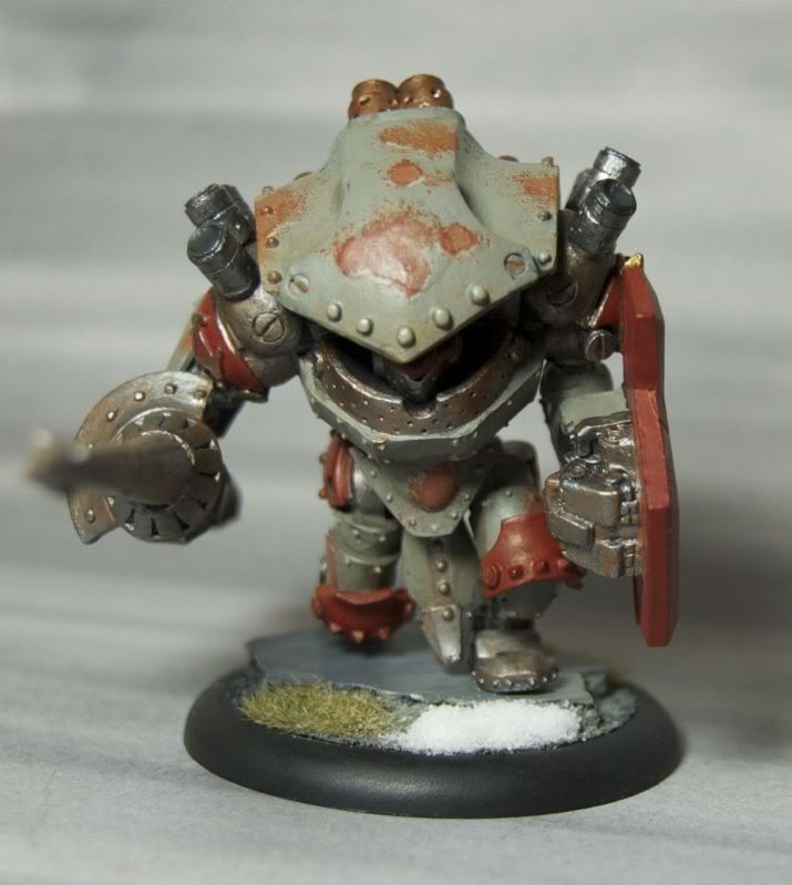 I thought I'd put up a thread for my Khador miniatures, since I've been painting more of them recently. This is my second Greylord Ternion unit, testing a scheme for a planned Zerkova Tier 4 list. I wanted to go for more muted colors, so the base for this is Cryx Bane Highlight, washed in places with Thornwood Green, highlighted with Hammerfall Khaki washes, with armor plates in my standard darker rusty red.