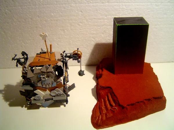 an ork totem or a necron euhm.. whatever summning stone or something  the ork thing is made of a sprue skeleton with cardboard/plasticard/bitz glued on it, the black cube has green lines on the sides donno if its clear in the pics..