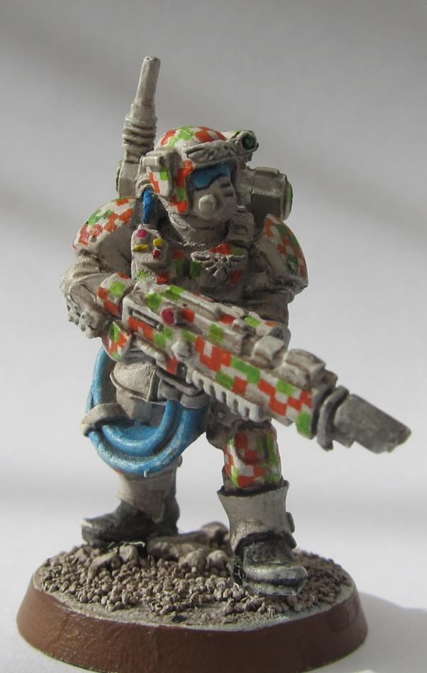 Now for the pattern, it is going to be hard because like you mentioned it must be very small. Don't worry about specific shapes being done on every model the same. Masking is going to be too much work and the end result won't be great most likely. Skip the Brown wash on the black base coat, it won't make a difference. After you prime it in black fully coat it with Khemri Brown and the wash it with Devlan mud. Don't slather it and let it pool in the recesses, were just darkening up the Brown base. Once that is dry take a sharp fine detail brush and your pot of badab black wash and carefully outline all the pattern shapes on the uniform. It will be very light but dark enough to see. When that is done go back with your other camo colors and fill in your outlined blocks of digi. The grid technique won't be useful here because it is a random pattern and grids are more useful for perfect patterns like diamonds and checkerboard IMO. The best advice I can give you is take your time and get the wash outline perfect, freehand is the way to go with this pattern. This technique will produce a great quality digi cam as long as you stagger your colors properly and make the pattern blocks tiny and sharp. Good luck hope this helped.