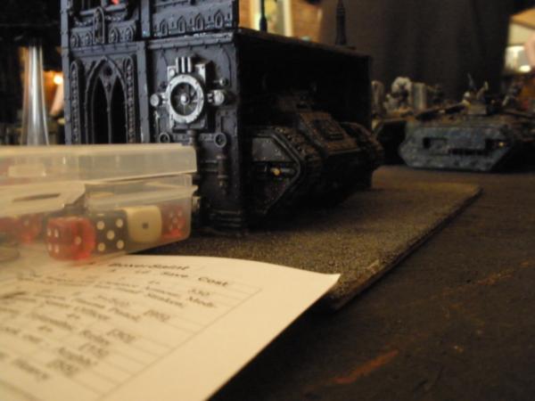 I won the roll off and elected to go first. I deployed my Vendettas centrally, and my two demolishers were off to the right, giving cover to my chimera wall that was also on the right. Scenario rules allowed for one troop unit to outflank, and you could choose which board edge it game in on when it arrived from reserves, so I put a unit of melta veterans in reserve to help out al'rahem's platoon. Finally, the manticore was stuck beneath a building in my deployment zone, shown below.