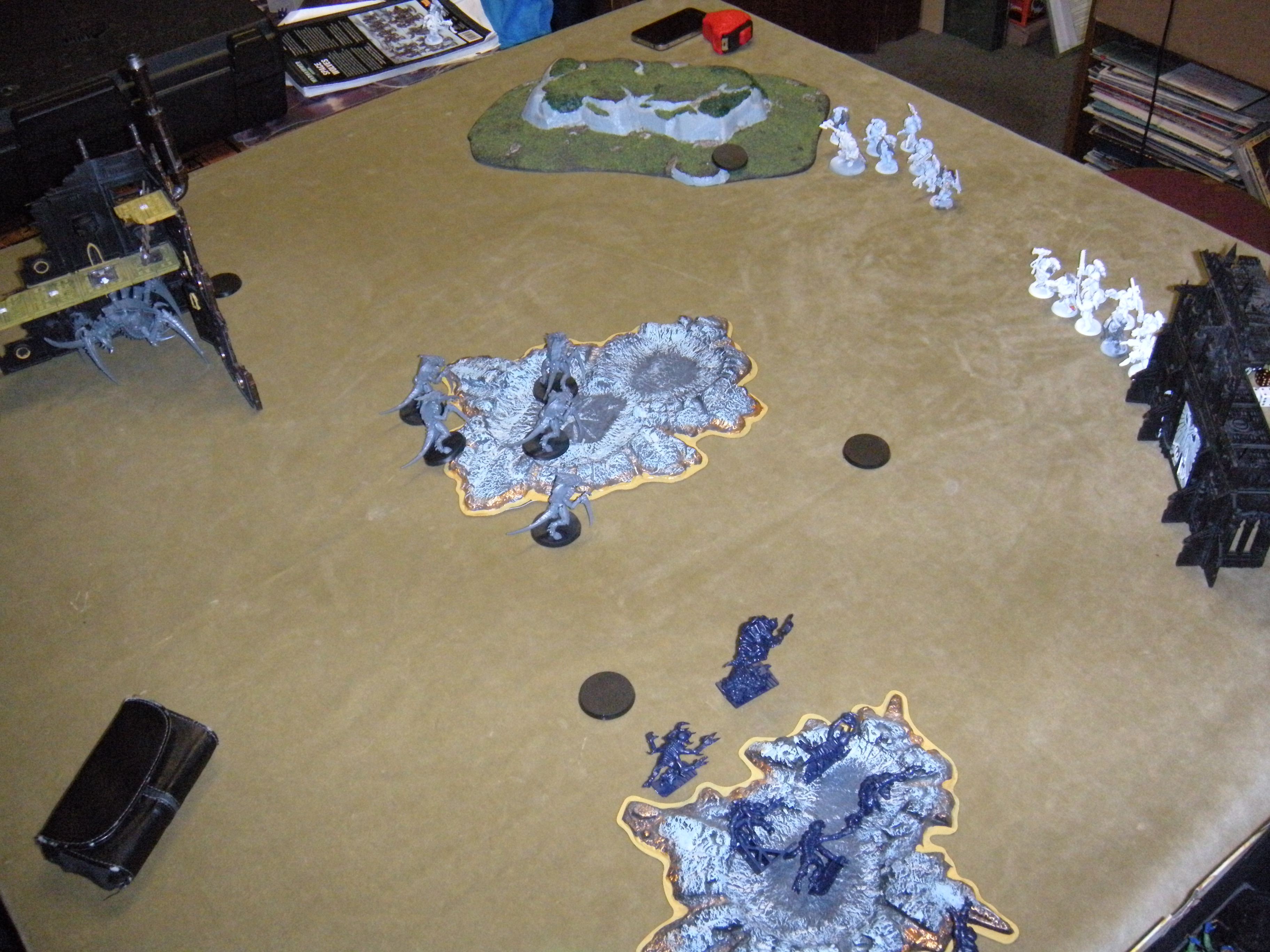 The objectives were deployed in a triangle around the center of the board. I put my Warriors in the middle crater, hid my Tervigon in the corner in the building and the stealers infiltrated in a crater to the right.