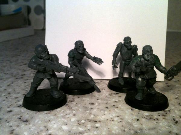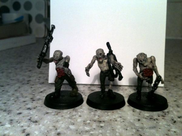 I then followed it up with a dry brushing of Rotting Flesh, Leviathan Purple was and then another coat of Rotting Flesh. The uniforms and wounds are very simple - just Catachan Green and a combination of Scab Red and Blood Red. I've not quite finished them as I didn't have an appropriate brown for their boots etc. I hope to pick up something today and paint another batch tonight. C&C welcome.