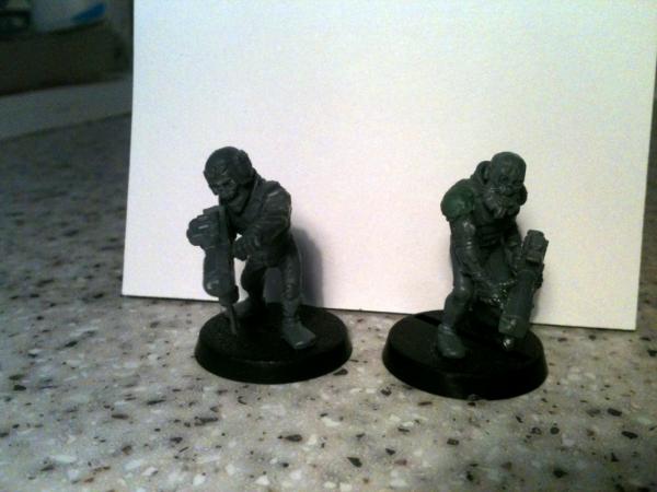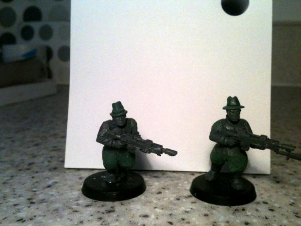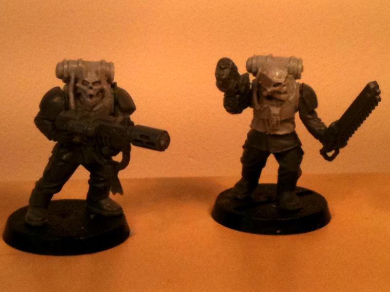 These are my first attempts at veterans. These will be the 'dispicable gentlemen' who have teamed up with Valois. They are based on Cadians and are my first ever attempt at large scale green stuff work. Though they are pretty basic, I'm fairly pleased with them for a first attempt. I am, however, going solely on instinct with the green stuff so any advice would be much appreciated.