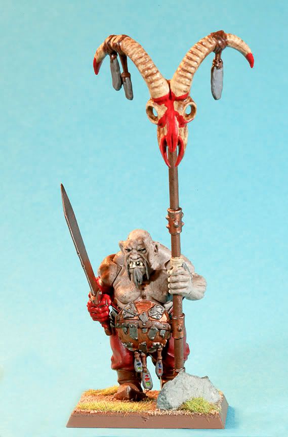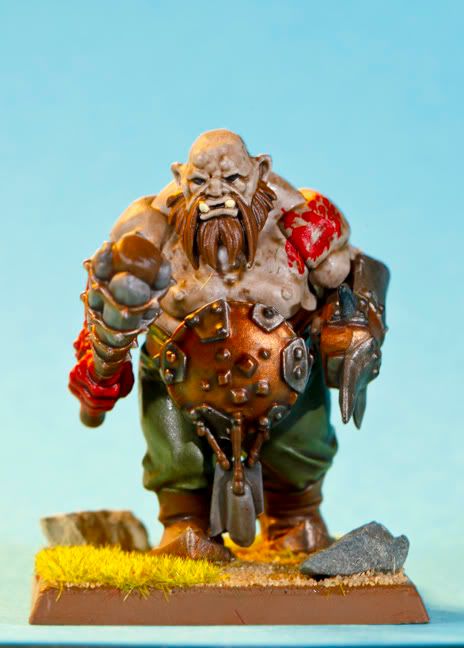 As for a color scheme, i would reccomend if you plan on them being chaos ogres have them in the color of the god they are aligned with. Khorne is a popular Chaos God for the Ogres, he is worshipped alongside the Maw, equal in power and importance. Skulls are offered to Khorne, and also picked meticlously clean to appease the Maw.
