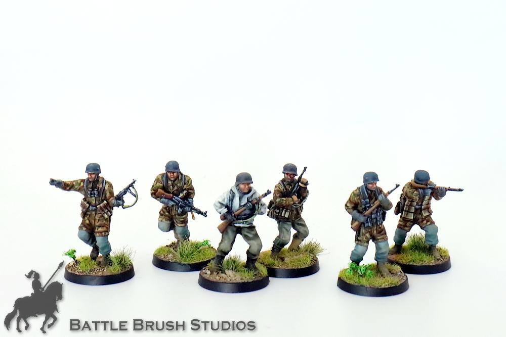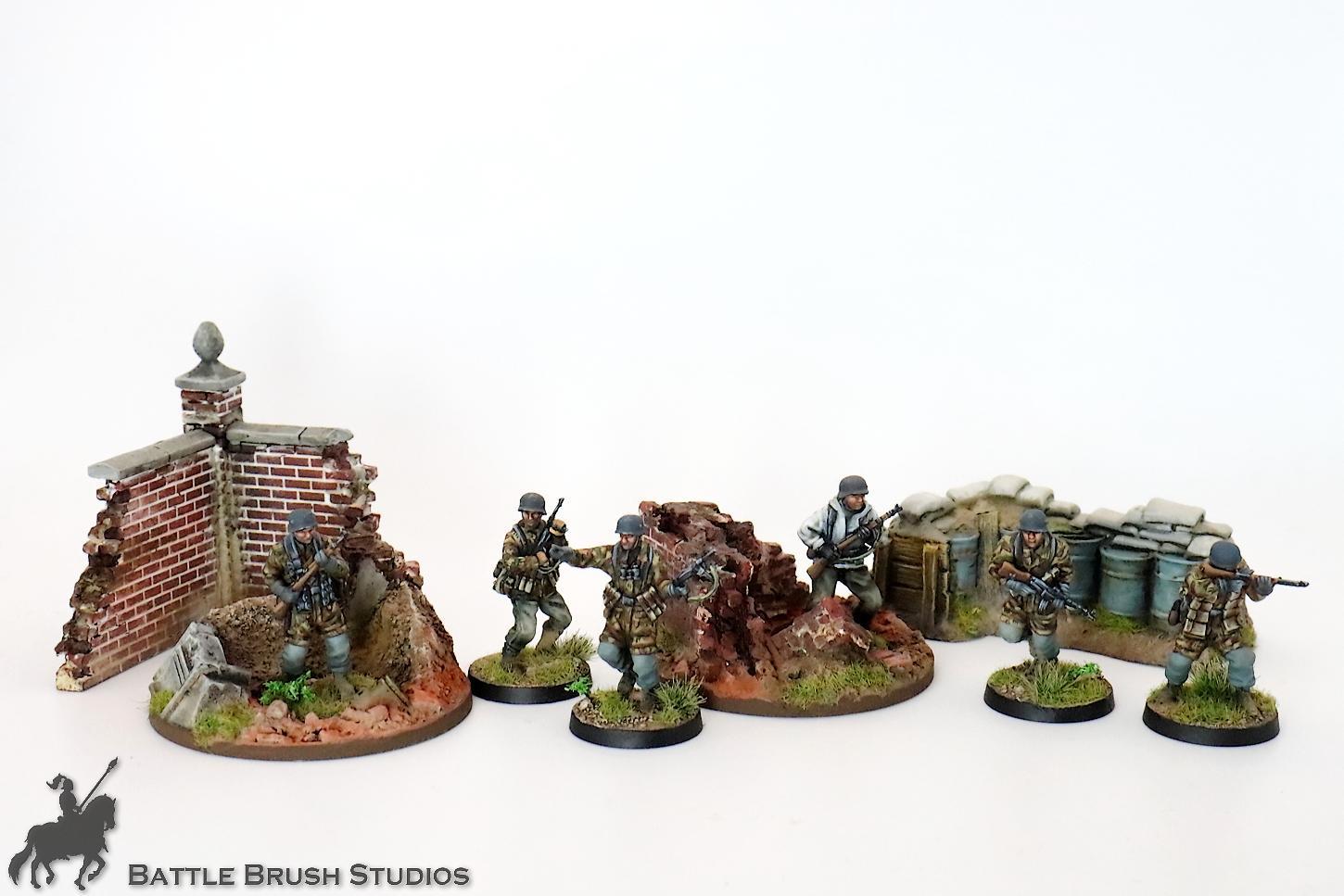 Four Fallschirmjägers and two Grenadiers, along with some terrain. 1-48 Tactic is an interesting gema. A very small skirmisher, quite abstract (you can see these terrain pieces that have cut-outs for figure bases, so you can put a model in each one). Figures are 1:48 scale, hence the name. All digitally designed, as far as I know, a few years ago. In my opinion, you can see that in the somewhat poorly detailed faces, especially on the earlier figures. Here we have a mixture of grenadiers and paratroopers; the latter are better drawn. Of course, with the scale (here we can really speak of a scale, not a figure size  ) you can also use various figures from scale model manufacturers. At least in German-speaking areas I think that 1:48th scale never played a big role in scale models, apart from airplanes. I think diecast is also quite big in this scale; Richard Clarke likes to use vehicles of this scale with 28mm figures.
