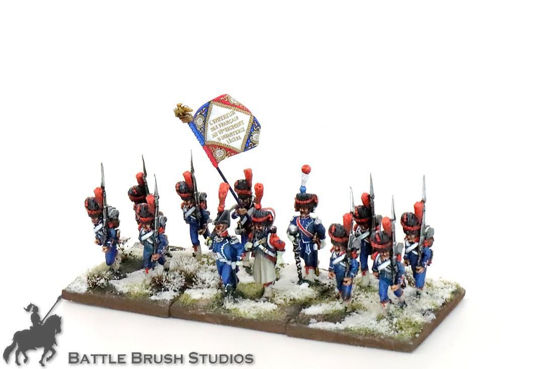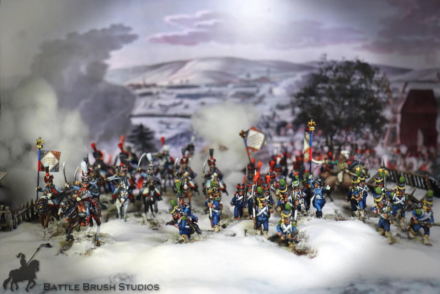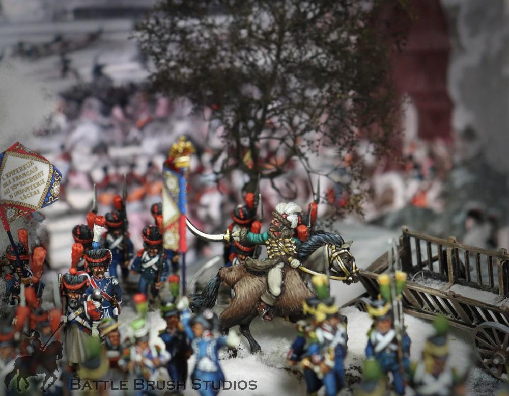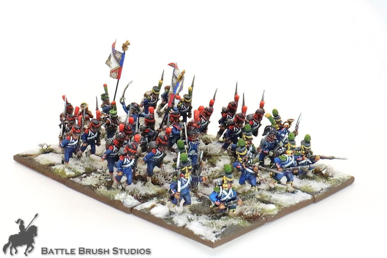 @Gitsplitta: Cheers! Yeah, it's a special little thing. Especially since when I first got it, it was a really rougly-cast brick.  But it has this rogue-trader-ish alien coolness to it, so I had to make it look nice. @Camkierhi: Thanks, I really appreciate that. Heyhey, here I am again. With pictures! First, 28mm Napoleonic French for the battle of Eylau, 1807: For the “army shots" (it really is just two formations) I did something different than just taking a wintry background. The background here is the battle painting of the Battle of Jena by Rugendas. Ok, wrong battle, but it looks like it fits.  And the time fits. At least that's something. Anyway, I'm quite happy with the result because the guys look a bit like they're jumping out of the painting. They don't really look “realistic” either, but very dressed up. What I also really like (and which also helps the somewhat artificial look) is that Murat looks like a flat figure.  He's definitely a fully-sculpted regular figure, just modeled very much in the style of a flat figure. But really nicely done and beautifully cast. 3rd Hussars: Represented by two companies - one line and one elite company. Here's the elites, bearskins and a hussars sapeur(!): The flag I got supplied with the unit was in fact the flag for the 10th hussars, so I was asked to repaint all the numbers in the flag (9) to be little threes.  As you wish.. Hussars officer in his chic red leather boots: Here's the other unit - light infantry: I'm not quite sure how exactly they are represented here, but it's quite interesting and depicts a lot of interesting bits about French light infantry of the time. Each formation consists of 3 bases. Skirmishers in front (Voltigeur-Chasseurs from Front Rank, beautiful as always). Note the “drooping” plumes on their shakos. Behind them, three bases of Carabiniers, the grenadier equivalent of light infantry. All with bearskin caps and red cords. They even have their own flag, sapper and, most importantly, a leader of the regimental band! Behind them (in the first picture) there's an interesting representation of a regular light infantry batallion: From us on the left, Carbiniers again, then the chief party with eagle, flag, drummer and vivandiere and then a base with Chasseurs (with hunting horn instead of drum, as befits the light infantry). Cool figures, as always very nicely put together by the gentleman for whom I was allowed to paint them. Technically they're three different units (for Valor & Fortitude), but they also make a great attack column: And then something else! French artillery train for Spain. A caisson wagon (with ammunition for cannons and muskets) as well as an ostentatious carriage to transport cannons from A to B. And a funny, black and white doggo. Automatically Appended Next Post: Next: Add-on to a Fankish Saga army I made in 2015/16!  "Sound the alarm! Exotic steppe warriors gathered to raid the village!" 24 levy troops, including a motivational speaker (the first and only metal figure in this army!): 4 mounted veterans: ...and here's something exotic - Pechenegs (as Mounted Steppe Warrior Mercenaries)! These are built from the Heavy Arab Cavalry box from Gripping Beast. The gentleman I'm building and painting the army for had seen the Pechenegs in a movie, thought they were exciting, and sent me a screenshot for reference: So the guys were supposed to look wild and un-fancy. They also had to look un-Arabic (because they weren't Muslims at the time), and they all had to be equipped with bows. The construction was time-consuming, because the poses for bows are limited for the heavy Arabian cavalry. Here and there I used a head from another box. Normally I would have made them colorful, but that wasn't possible. So I took refuge in the trick of painting saddlecloths as cowhides and other animal skins and painting on textures. Arrow quivers were covered with fragments of paper tissues soaked in glue to give them texture too. So these guys were an interesting challenge, but I think it worked out, and they look suitably different to the rest of the army and have a rather unique look now. Now on to fantasty things. I got to paint a Frosthaven figure again. ...and three happy frogs! Nurgle stuff is always fun to paint.  Hope you like all the stuff!