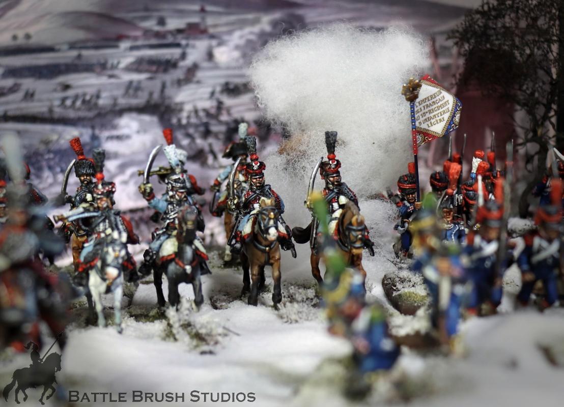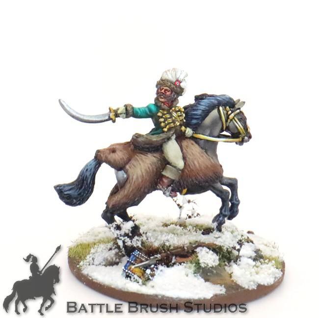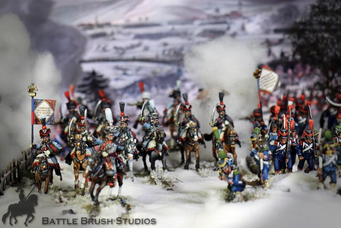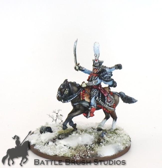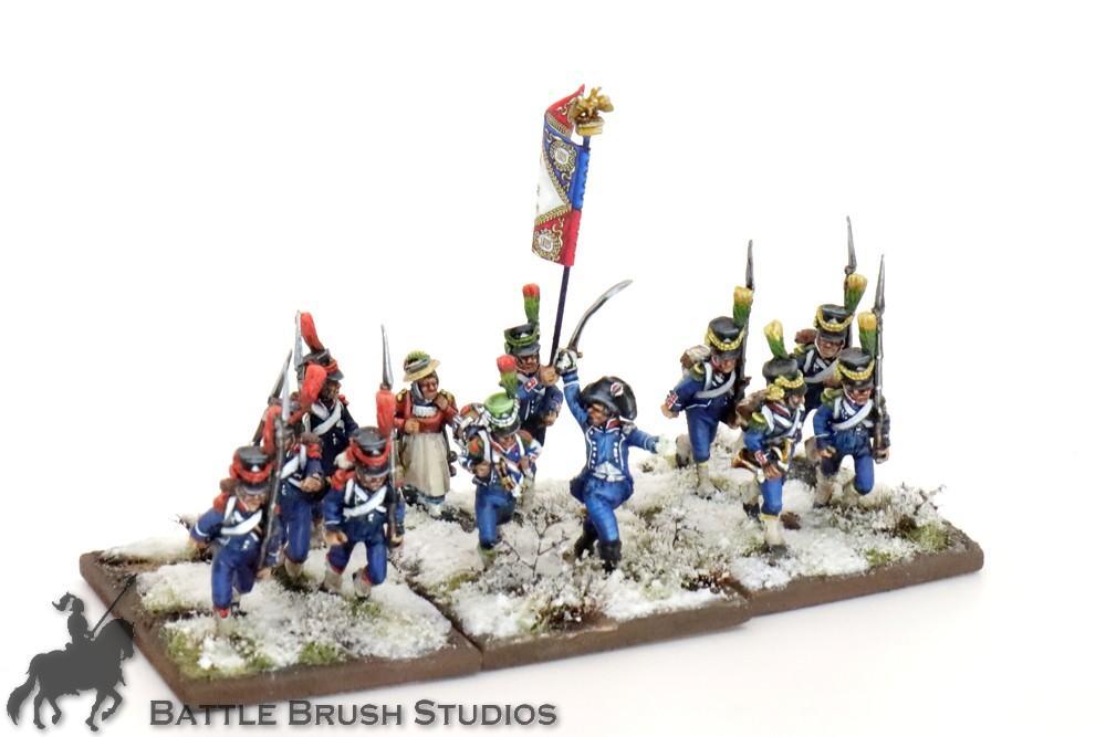 @Gitsplitta: Cheers! Yeah, it's a special little thing. Especially since when I first got it, it was a really rougly-cast brick.  But it has this rogue-trader-ish alien coolness to it, so I had to make it look nice. @Camkierhi: Thanks, I really appreciate that. Heyhey, here I am again. With pictures! First, 28mm Napoleonic French for the battle of Eylau, 1807: For the “army shots" (it really is just two formations) I did something different than just taking a wintry background. The background here is the battle painting of the Battle of Jena by Rugendas. Ok, wrong battle, but it looks like it fits.  And the time fits. At least that's something. Anyway, I'm quite happy with the result because the guys look a bit like they're jumping out of the painting. They don't really look “realistic” either, but very dressed up. What I also really like (and which also helps the somewhat artificial look) is that Murat looks like a flat figure.  He's definitely a fully-sculpted regular figure, just modeled very much in the style of a flat figure. But really nicely done and beautifully cast. 3rd Hussars: Represented by two companies - one line and one elite company. Here's the elites, bearskins and a hussars sapeur(!): The flag I got supplied with the unit was in fact the flag for the 10th hussars, so I was asked to repaint all the numbers in the flag (9) to be little threes.  As you wish.. Hussars officer in his chic red leather boots: Here's the other unit - light infantry: I'm not quite sure how exactly they are represented here, but it's quite interesting and depicts a lot of interesting bits about French light infantry of the time. Each formation consists of 3 bases. Skirmishers in front (Voltigeur-Chasseurs from Front Rank, beautiful as always). Note the “drooping” plumes on their shakos. Behind them, three bases of Carabiniers, the grenadier equivalent of light infantry. All with bearskin caps and red cords. They even have their own flag, sapper and, most importantly, a leader of the regimental band! Behind them (in the first picture) there's an interesting representation of a regular light infantry batallion: From us on the left, Carbiniers again, then the chief party with eagle, flag, drummer and vivandiere and then a base with Chasseurs (with hunting horn instead of drum, as befits the light infantry). Cool figures, as always very nicely put together by the gentleman for whom I was allowed to paint them. Technically they're three different units (for Valor & Fortitude), but they also make a great attack column: And then something else! French artillery train for Spain. A caisson wagon (with ammunition for cannons and muskets) as well as an ostentatious carriage to transport cannons from A to B. And a funny, black and white doggo. Automatically Appended Next Post: Next: Add-on to a Fankish Saga army I made in 2015/16!  "Sound the alarm! Exotic steppe warriors gathered to raid the village!" 24 levy troops, including a motivational speaker (the first and only metal figure in this army!): 4 mounted veterans: ...and here's something exotic - Pechenegs (as Mounted Steppe Warrior Mercenaries)! These are built from the Heavy Arab Cavalry box from Gripping Beast. The gentleman I'm building and painting the army for had seen the Pechenegs in a movie, thought they were exciting, and sent me a screenshot for reference: So the guys were supposed to look wild and un-fancy. They also had to look un-Arabic (because they weren't Muslims at the time), and they all had to be equipped with bows. The construction was time-consuming, because the poses for bows are limited for the heavy Arabian cavalry. Here and there I used a head from another box. Normally I would have made them colorful, but that wasn't possible. So I took refuge in the trick of painting saddlecloths as cowhides and other animal skins and painting on textures. Arrow quivers were covered with fragments of paper tissues soaked in glue to give them texture too. So these guys were an interesting challenge, but I think it worked out, and they look suitably different to the rest of the army and have a rather unique look now. Now on to fantasty things. I got to paint a Frosthaven figure again. ...and three happy frogs! Nurgle stuff is always fun to paint.  Hope you like all the stuff!