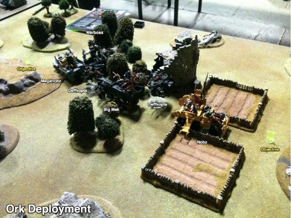 We rolled up a random Battle Missions mission - Wave Assault - a Tyranid mission. Guard won the roll off so Orks took the role of "the Enemy". Endtransmission probably won the roll off for choice of side too - and probably just chose the side he was already on (top) - I don't think the terrain particularly favored one side or the other...