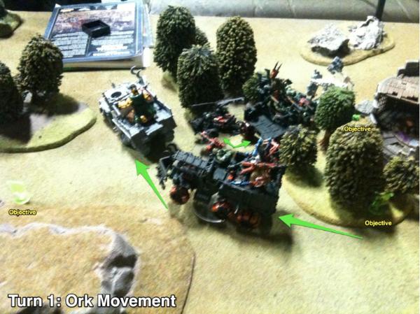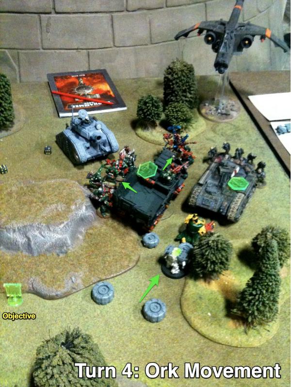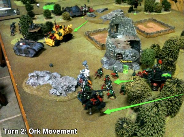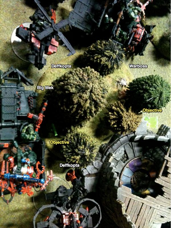 On the left flank, Skarag rejoins his boyz in their Trukk and move to the left objective, a lone Meganob legging it behind.