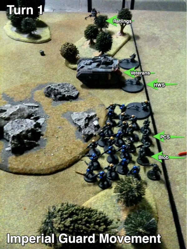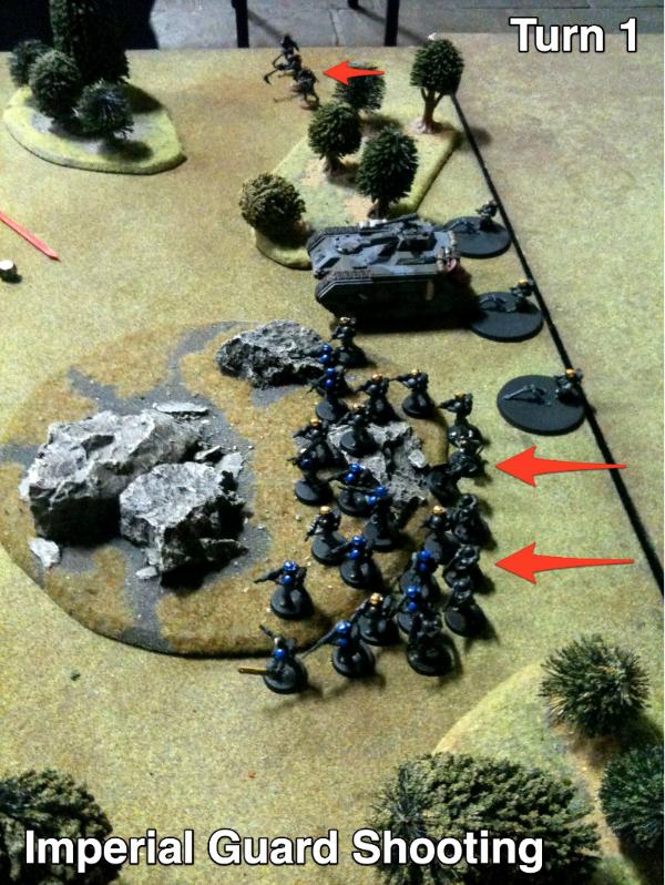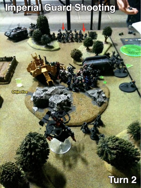 Endtransmission split his Guard up into three "waves" - they are denoted in the army list above in the order they appeared - for convenience only, they were randomly determined in game (ie he didn't know which would show up in each turn).