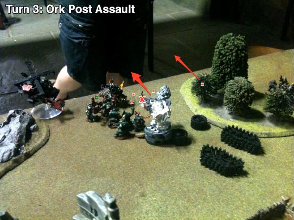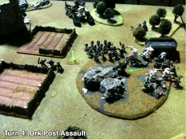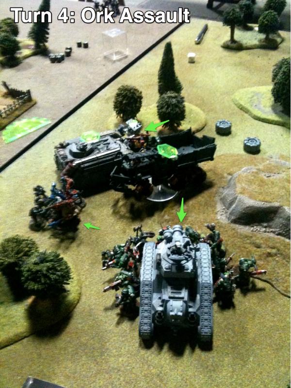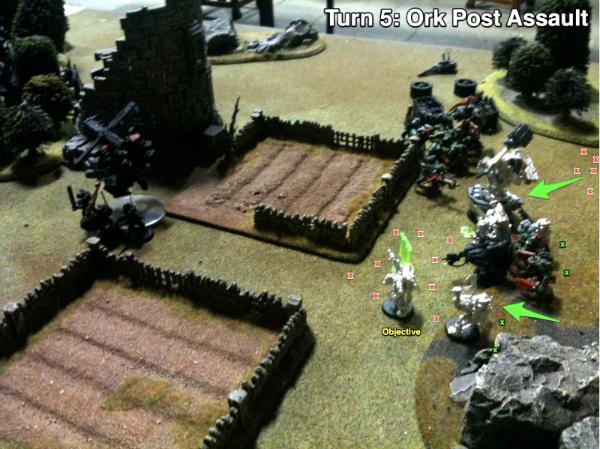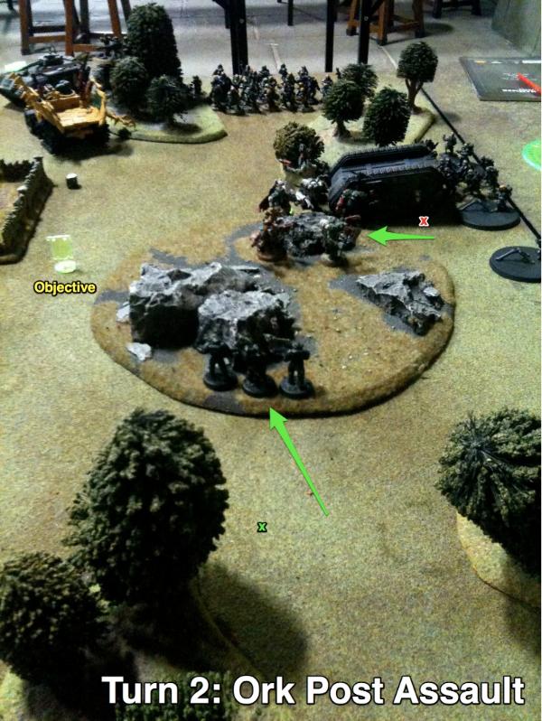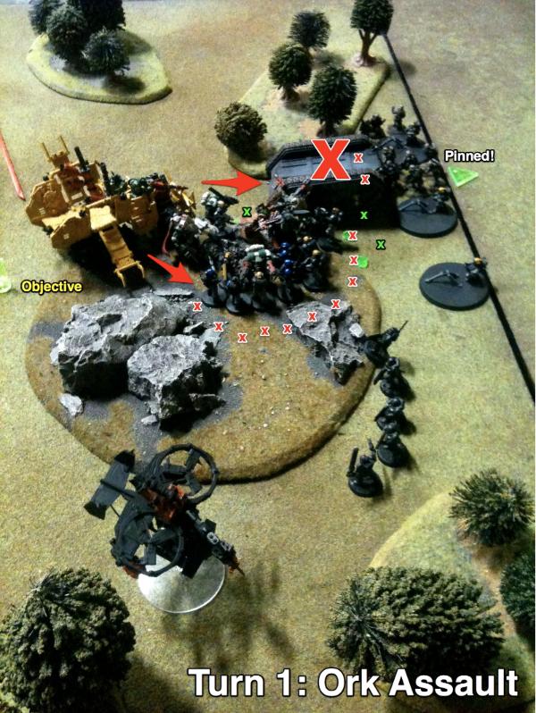 The new arrivals make their mark on the left flank, disembarking the Meganobz, thinning their numbers and pinning them to boot!
