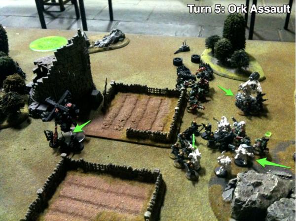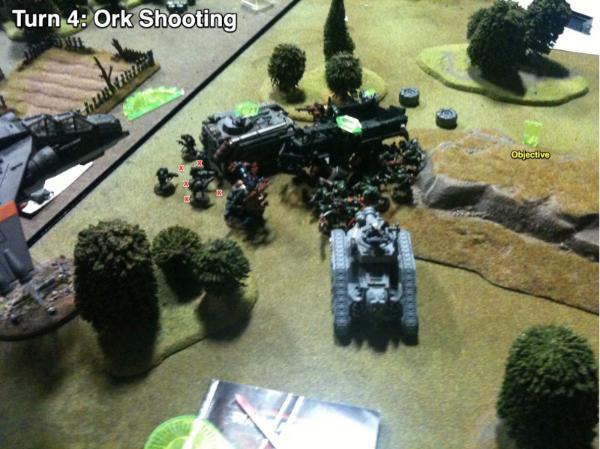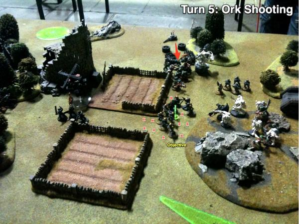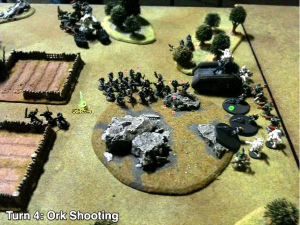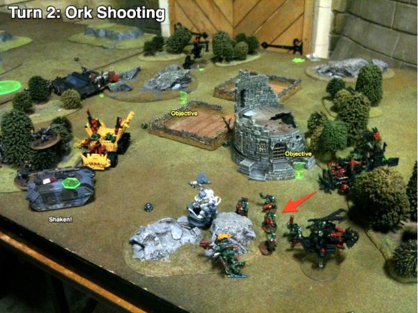 The right flank Guard shooting doesn't disappoint (well, the Guard anyway) - culling the Nobz and their ride (perhaps I should have gone to ground... the Painboy survived!)