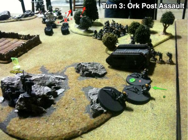 The Platoon Command Squad gets a lucky drop on the Deffkopta whilst the Nobz finish off the Commissar and dig into the rocks to await the full might of the Guard's guns.