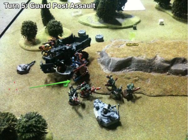 I think we rolled a sixth turn, but didn't have time to play it (or endtransmission was ready to concede...). The Guard only had three units left, and only one of those Troops, whilst the Orks had two troops left - one on an objective and one soon to be. For the Guard to claim a draw, the Platoon Command Squad would need to down the Deffkopta and consolidate/move/run towards the central objective - so we just played out that combat...